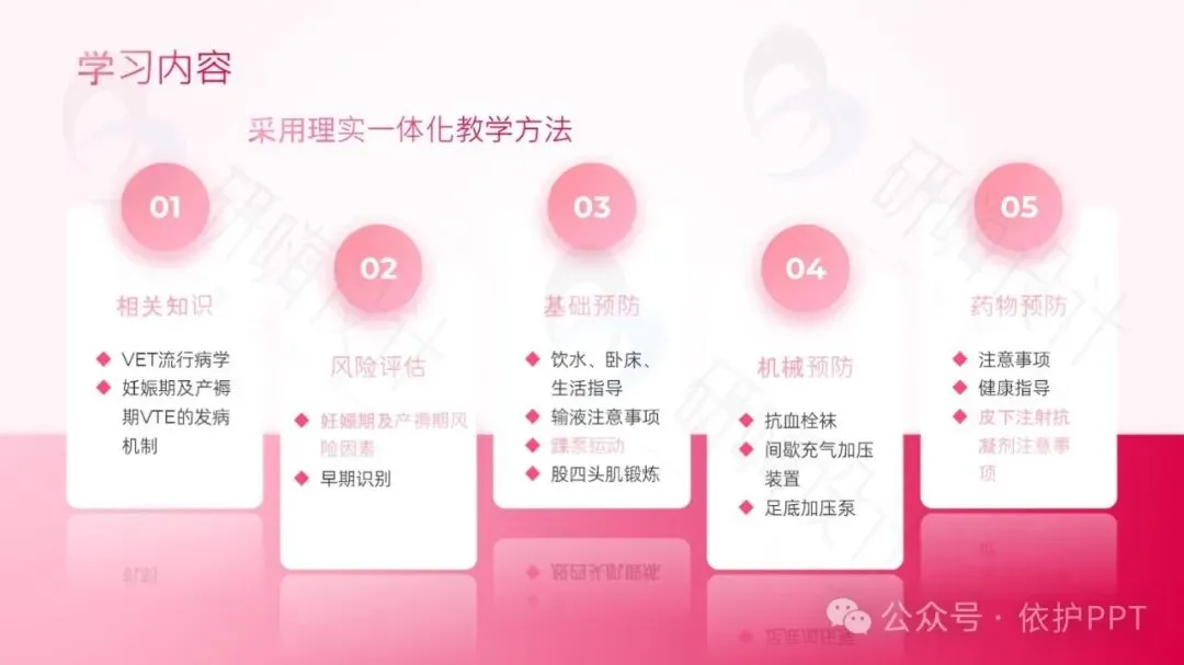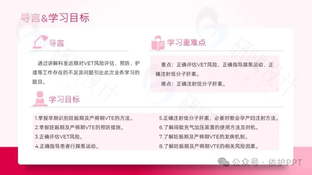 1.掌握早期识别妊娠期及产褥期VTE的方法。