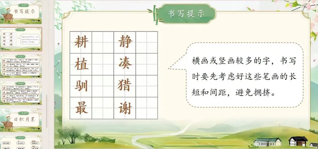 (1)横画或竖画较多的字,书写时要事先考虑好这些笔画的长短比例和距离,避免拥挤。
