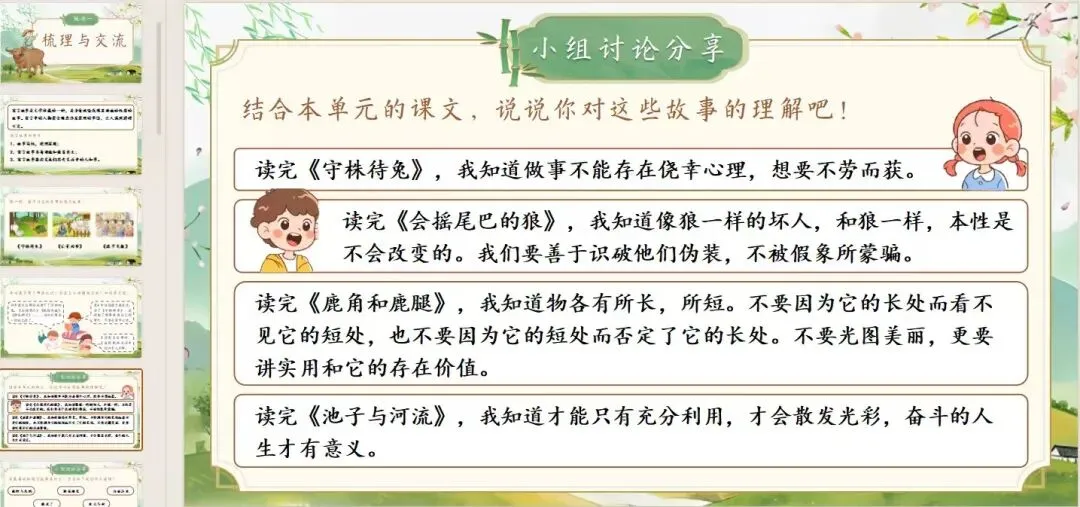 师:本单元我们学习了四篇寓言故事,那什么是寓言故事呢?我们一起回顾一下。