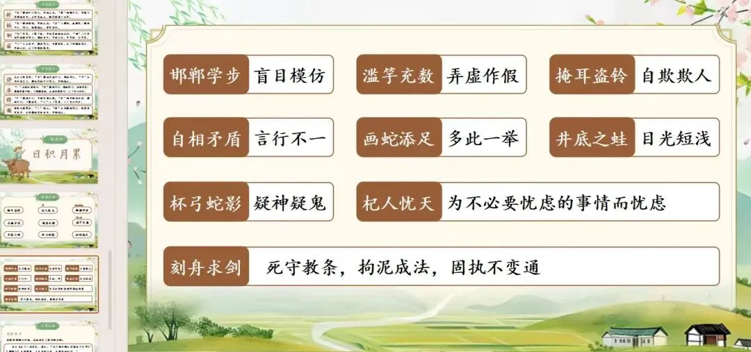 5、能够借助拼音认读成语,积累寓言成语,了解故事内容,明白道理。
