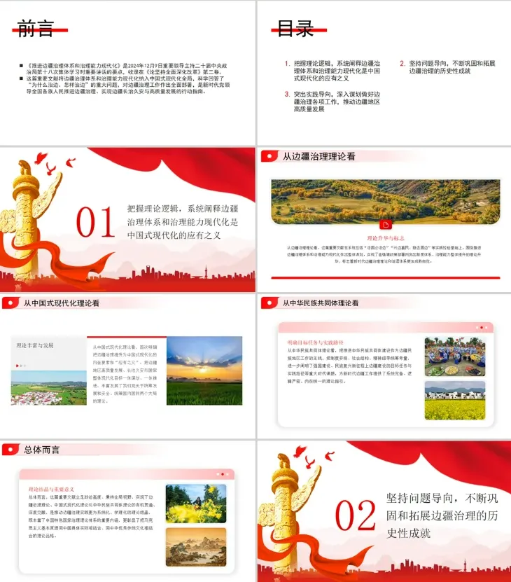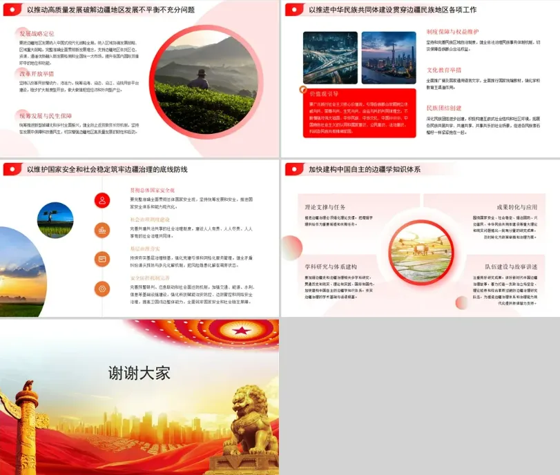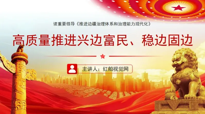 今天要分享的课件是:《党课高质量推进兴边富民稳边固边读重要领导《推进边疆治理体系和治理能力现代化》PPT课件》,讲稿字数:3104字,党课ppt页数:18页。推动边疆地区高质量发展与高水平稳定,对区域均衡与公共安全具有战略性意义。边疆区域通常面临基础设施薄弱、产业结构单一、人才引进困难等挑战,同时承担着维护秩序与促进交流的双重职责。传统的发展模式难以适应新形势要求,亟需通过系统规划,将资源优势转化为经济动能,在改善民生的同时增强发展韧性,实现从"输血式"扶持向"造血式"发展的转变。