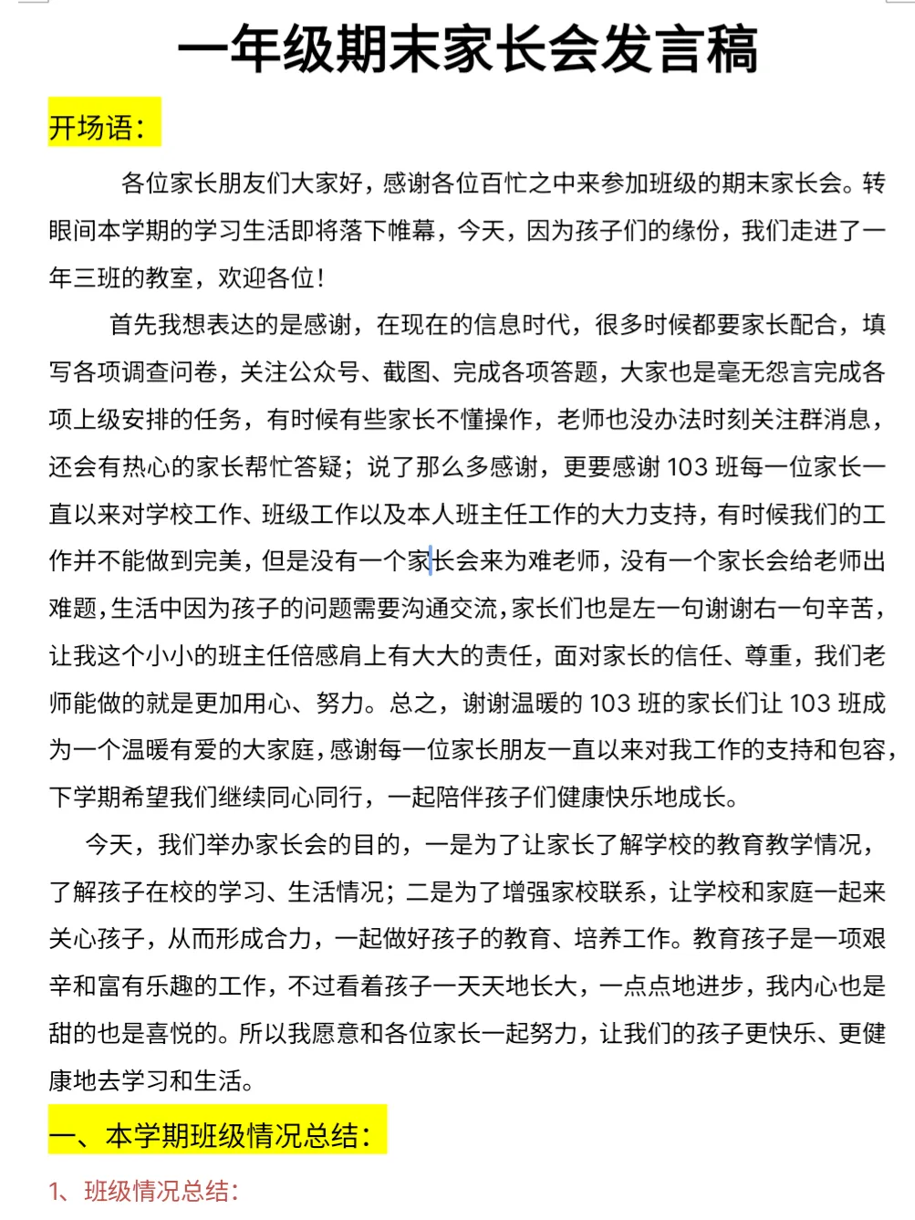 >一年级期末家长会配套课件和发言稿【超详细版】