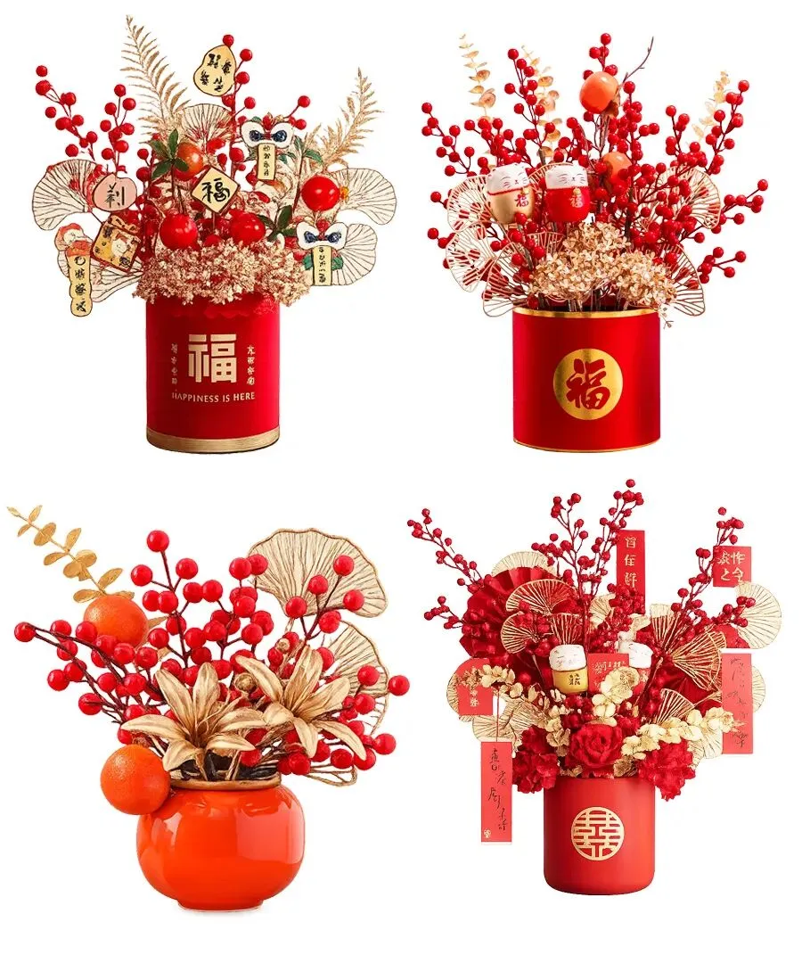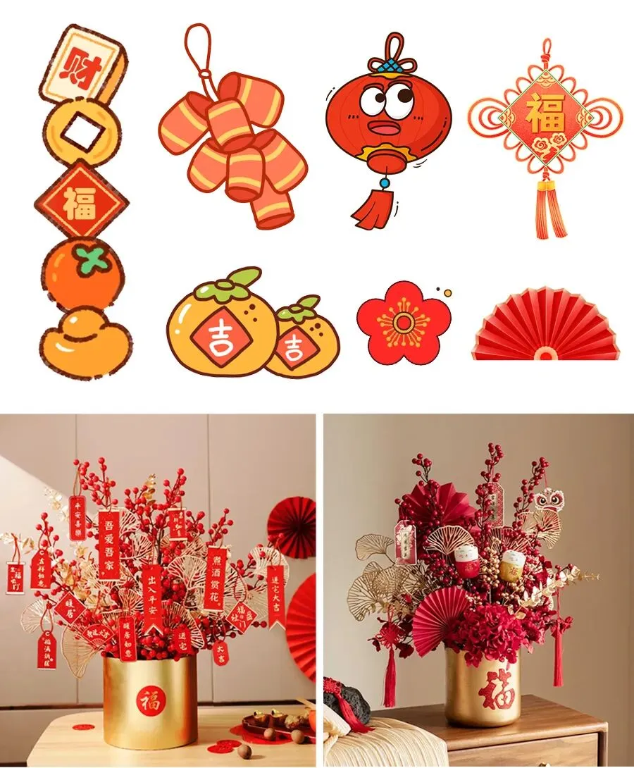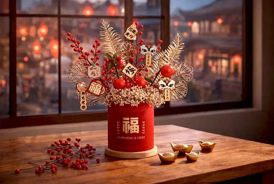 在众多的年宵花中,有两位无需费心打理却能长久火红的大明星——银柳与冬青。银柳的枝条细长飘逸,装点着毛茸茸的小花苞,谐音“银留”,寓意着“招财进宝、留住好运”;冬青则挂满了圆润亮红的果实,像极了微型的小灯笼,象征着“生活圆满、红红火火”。当我们把它们插在写着“福”字的红色福桶中,高低错落、疏密有致,便成了一道最美的风景。