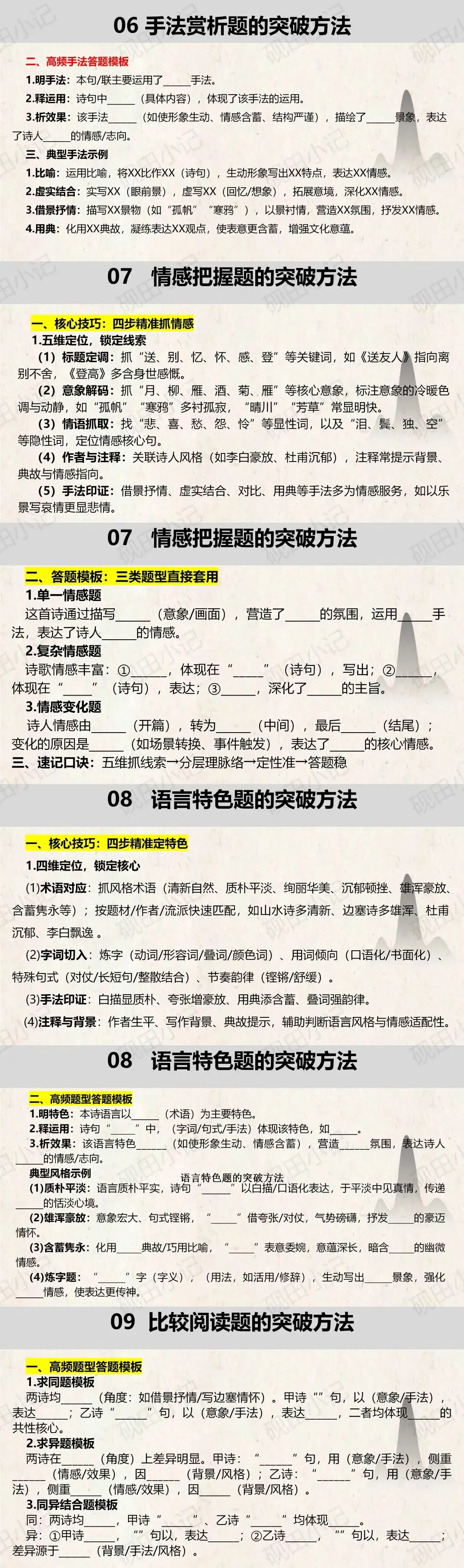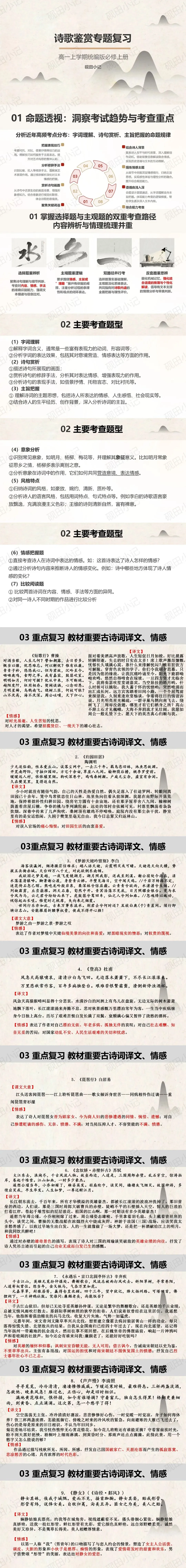 今天整理了常考的诗歌鉴赏课件,这份课件里有:✅ 高一期末考试12首高频古诗,按教材排序,讲最可能考的✅ 每类题型(情感/手法/意境)配标准答题模板,踩点就得分✅ 独家「情感脉络图」+「手法口诀表」,3分钟理清一首诗