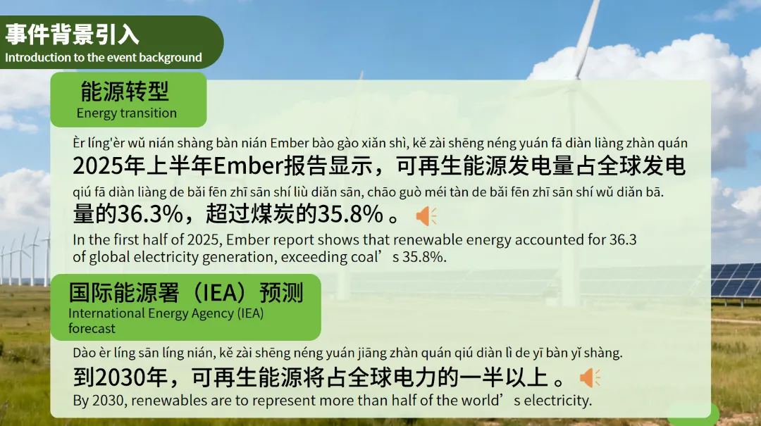 接下来,课件介绍了全球能源结构的转型。根据2025年上半年Ember报告,可再生能源发电量占全球发电量的36.3%,首次超过煤炭的35.8%。