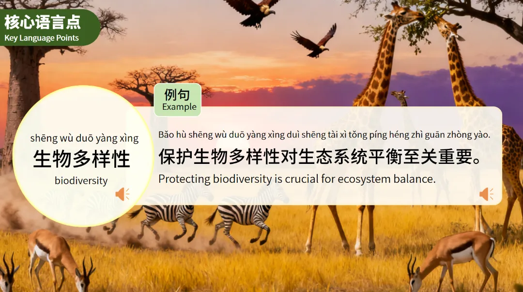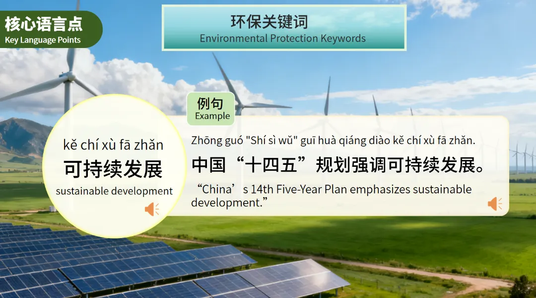 课件还重点讲解了环保相关的核心词汇,如“可持续发展”和“生物多样性”,并通过例句帮助学生理解和运用这些词汇。