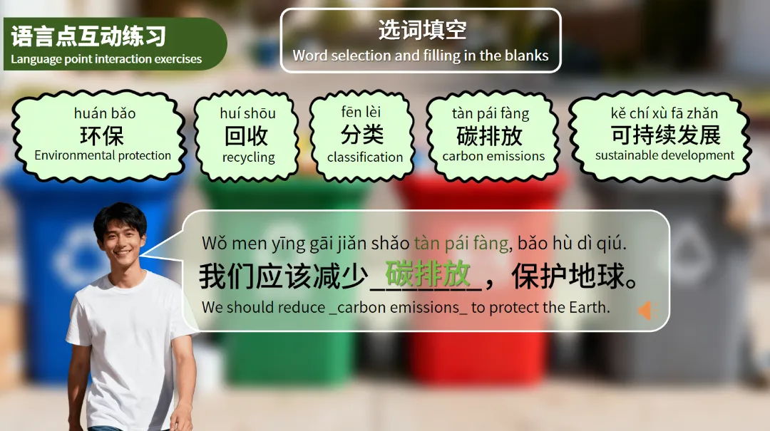 这个课件不仅涵盖了丰富的环保知识,还通过互动练习和实际案例,帮助学生提升汉语水平的同时,增强环保意识。