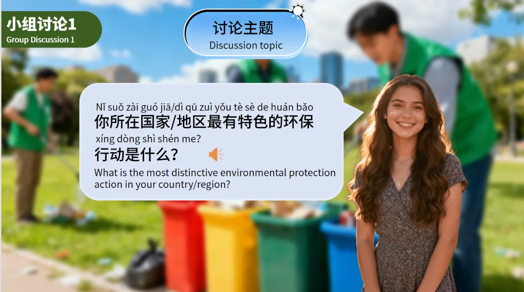 同时,小组讨论环节鼓励学生分享自己所在国家或地区的特色环保行动,促进课堂交流。