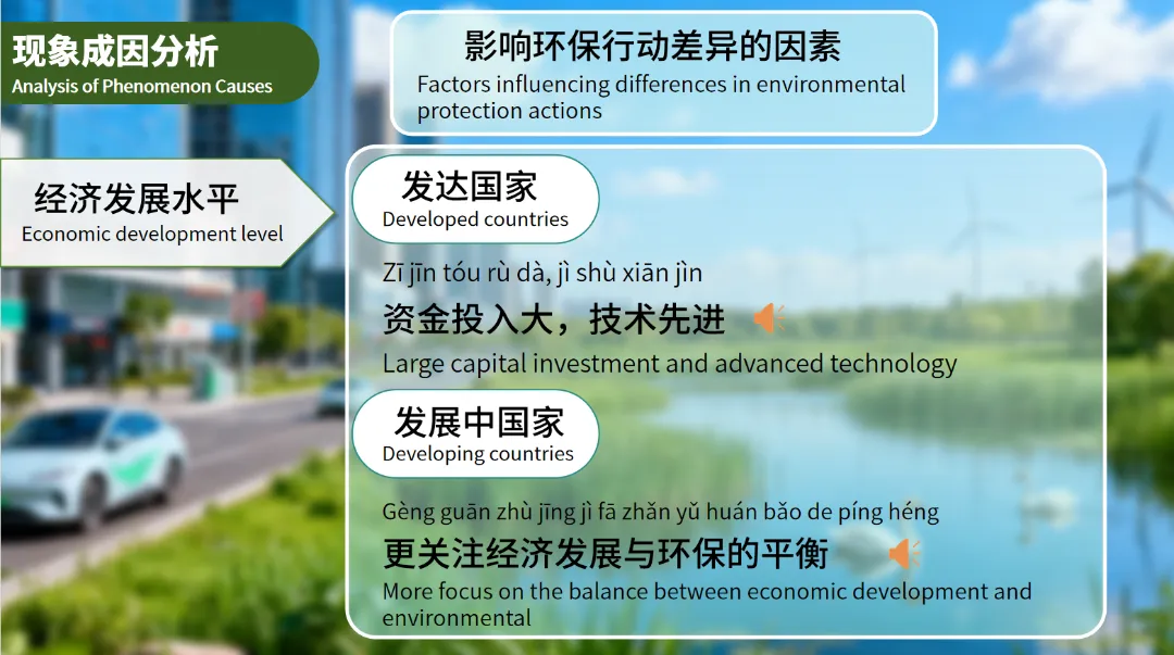 课件进一步探讨了不同国家和地区在环保行动上的差异及其原因。
