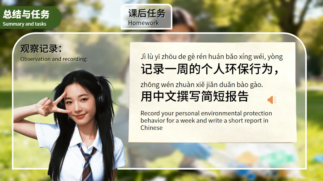 最后,课件布置了课后任务,要求学生记录一周的个人环保行为,并用中文撰写简短报告。