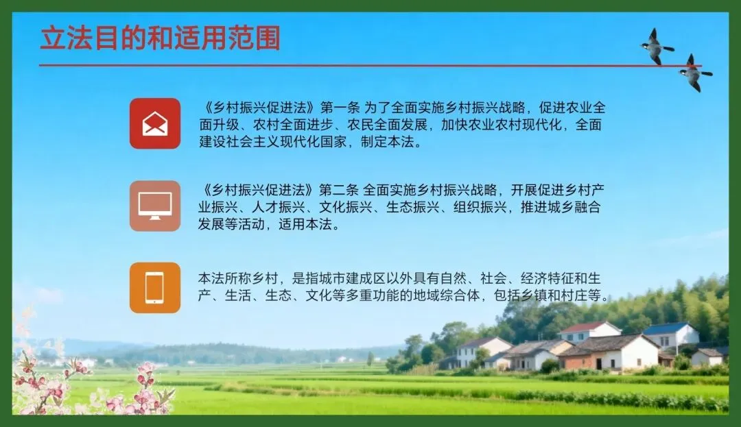 3.传承优秀传统文化:乡村是中华文明的精神家园。法律将“文化繁荣”列为专章,要求保护农业文化遗产和非物质文化遗产,加强对传统村落、乡村风貌的保护,推进移风易俗,培育文明乡风。这旨在守护中华民族的“根”与“魂”。