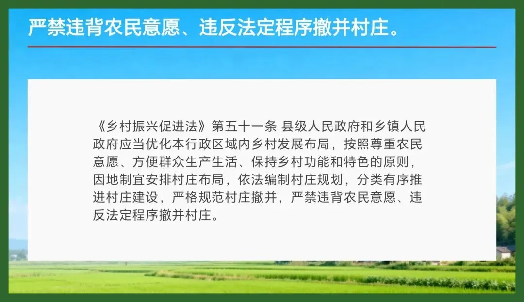 它强调坚持农民主体地位。根据《乡村振兴促进法》第四条第二项,全面实施乡村振兴战略,必须“坚持农民主体地位,充分尊重农民意愿,保障农民民主权利和其他合法权益,调动农民的积极性、主动性、创造性,维护农民根本利益”。这一原则贯穿法律始终。例如,法律明确规定“严禁违背农民意愿、违反法定程序撤并村庄”,这就是以法律的强制性条款,为农民的土地权益、居住权益和村庄共同体利益筑起了一道坚实的“防火墙”。法律还规定每年农历秋分日为中国农民丰收节,这不仅是庆祝丰收,更是提升农民荣誉感、幸福感的社会文化信号。
