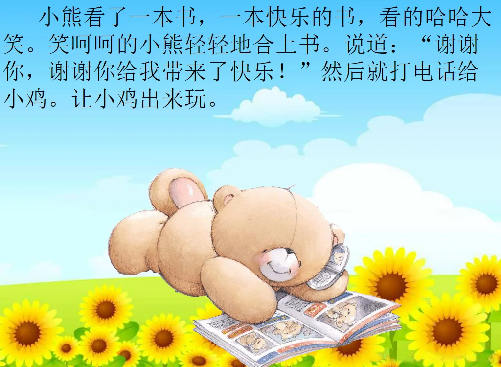 2、再次欣赏,帮助幼儿理解故事内容。 小鸡看到小熊说了什么? 小鸭看到小鸡说了什么? 小猫看到小鸭说了什么? 学说短句“你笑嘻嘻的XX真漂亮”。 小结:故事里,小熊把快乐传给了小鸡,小鸡把快乐传给了小鸭,小鸭又把快乐传给了小猫,最后他们又把快乐传给了小狗。原来快乐也是可以传来传去的。