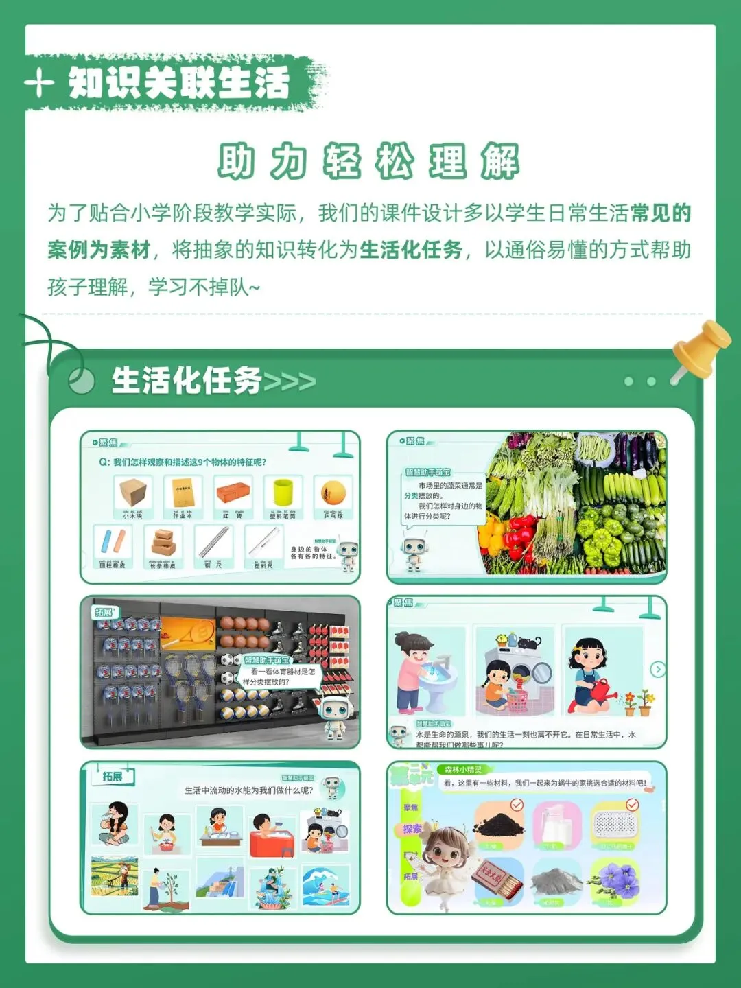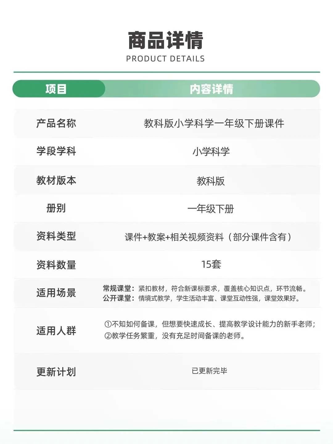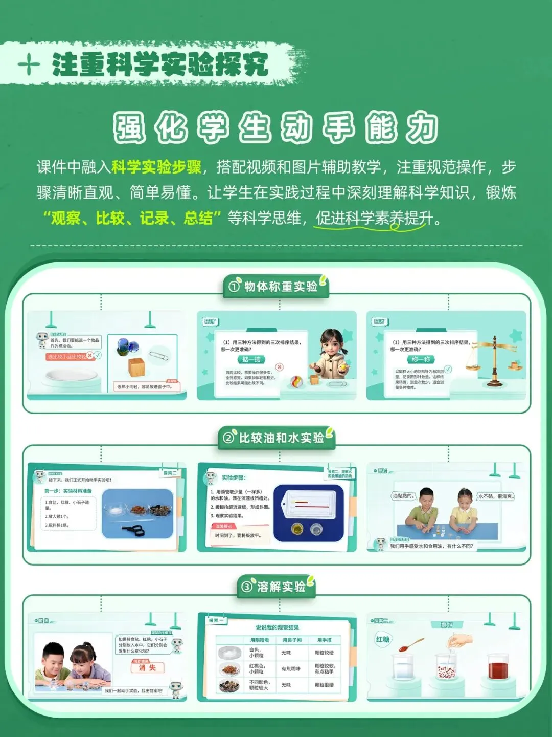 这是一套教科版小学科学一年级下册课件,共15套,配套教案与视频素材。它以大单元情境贯穿课堂,通过趣味互动、科学实验和生活化任务激发学生兴趣,还设置当堂检验巩固知识,专业美观的设计让备课更高效,非常适合新手老师和任务繁重的教师使用。