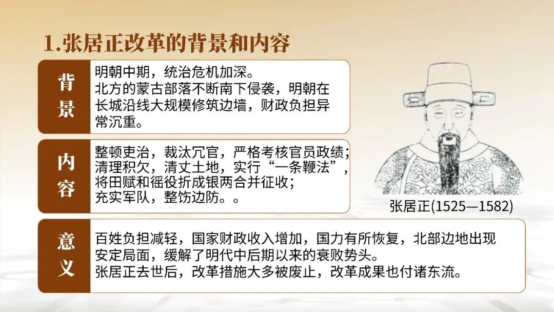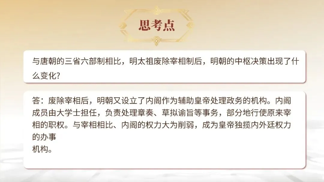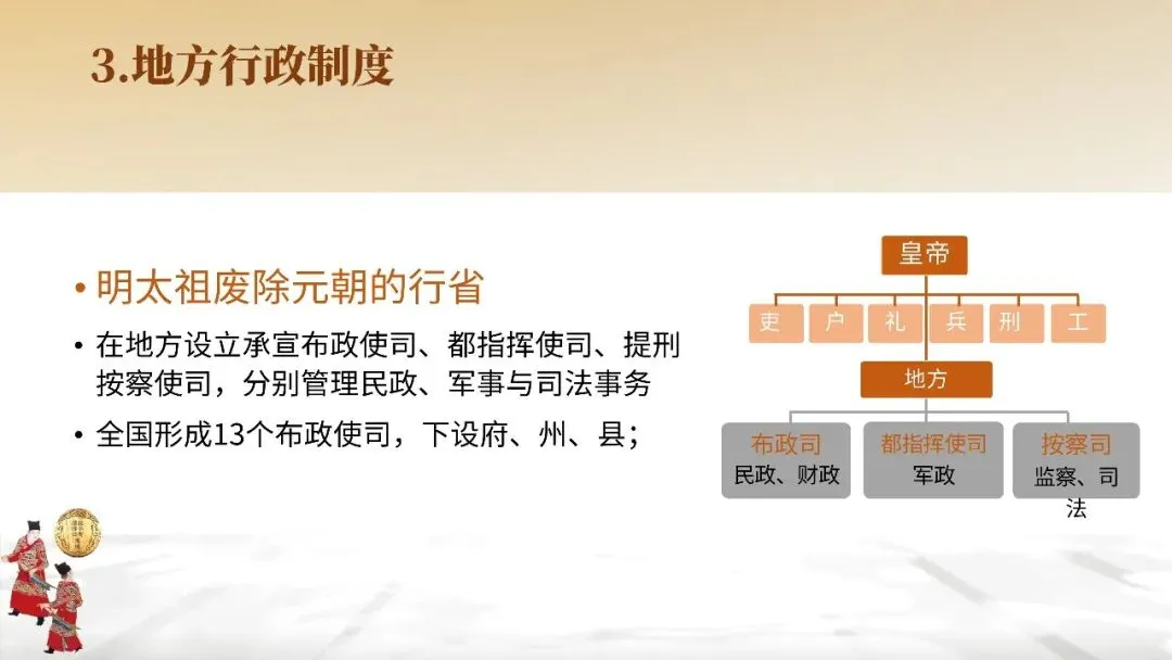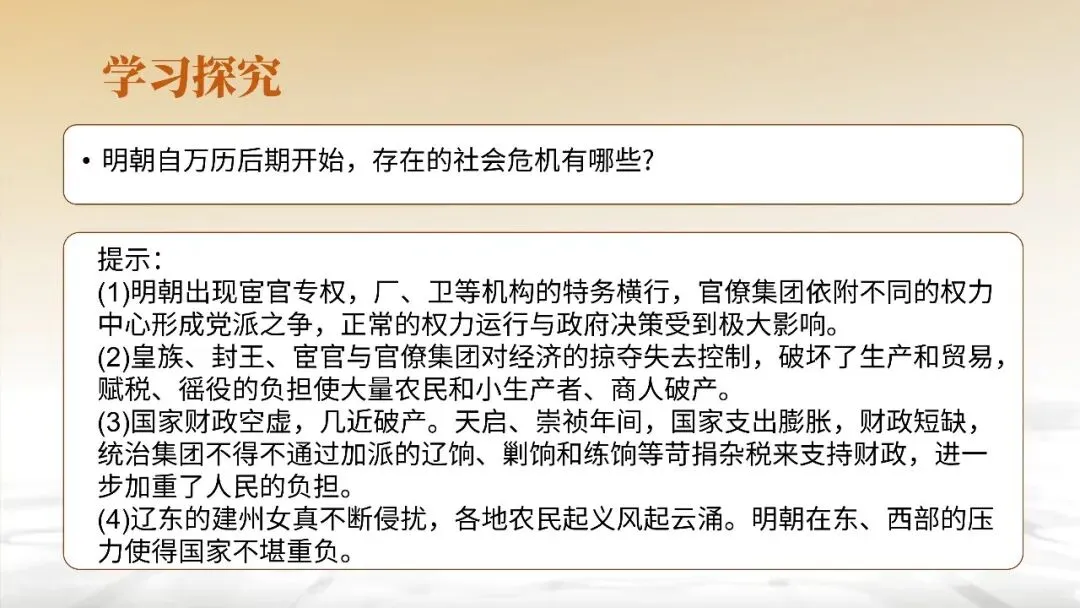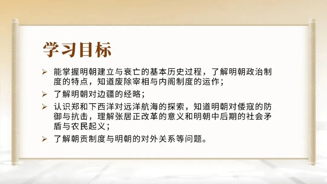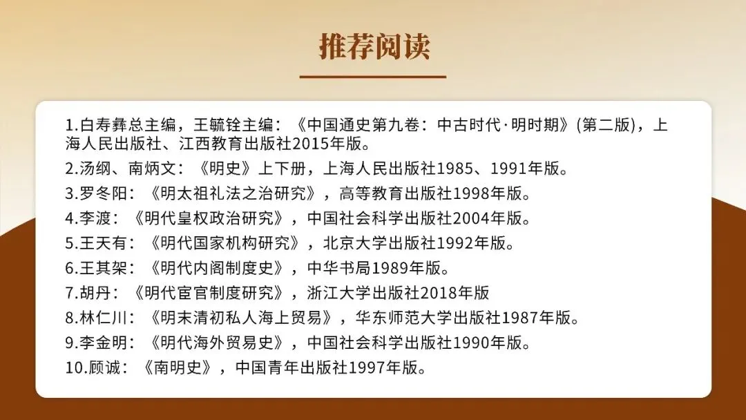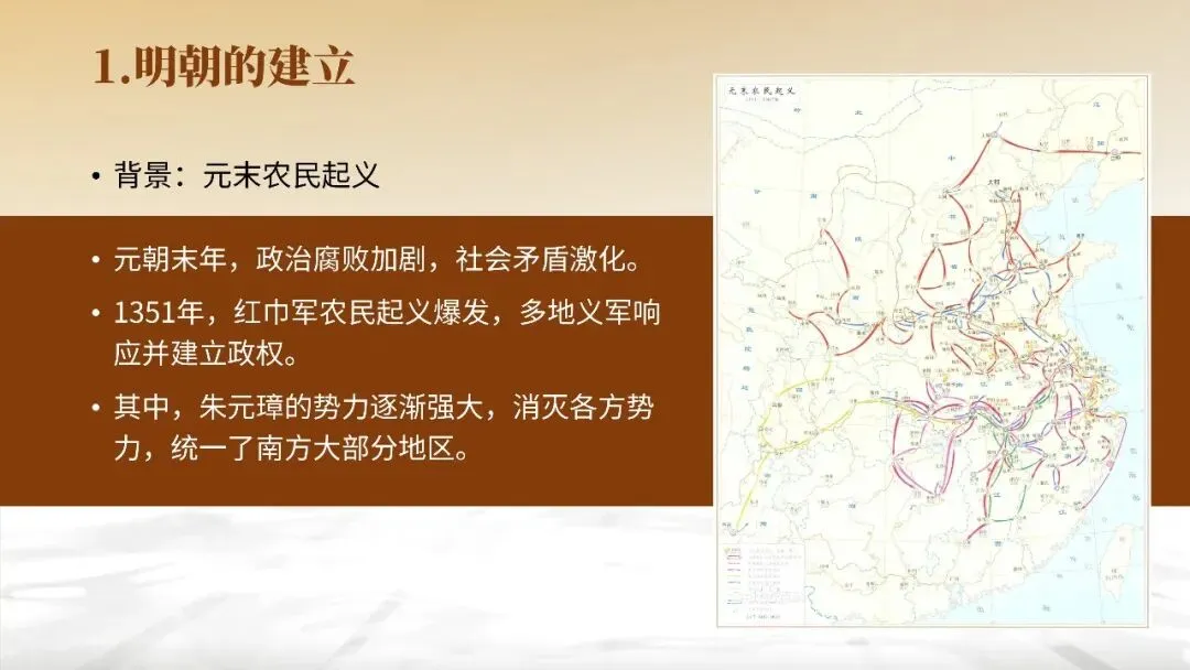 本课讲述明朝276年兴亡历程。1368年朱元璋建明,废丞相、设锦衣卫,强化皇权;永乐迁都北京、修《永乐大典》、派郑和七下西洋,国势极盛。中后期张居正改革一度中兴,然土地兼并、党争激烈,万历后期怠政,财政空虚;加之小冰期灾荒、农民起义与后金崛起,1644年李自成破京,崇祯自缢,明亡。明制为清所承,其兴亡经验成为后世集权王朝镜鉴。