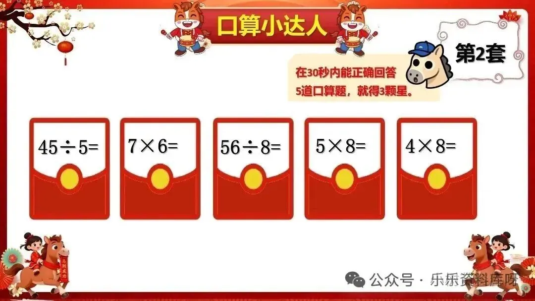 小朋友们,欢迎来到口算小达人。一共有4套题,请你随机抽取1张序号,抽中哪个序号就答哪套题;在30秒内能正确回答5道口算题,就得3颗星。