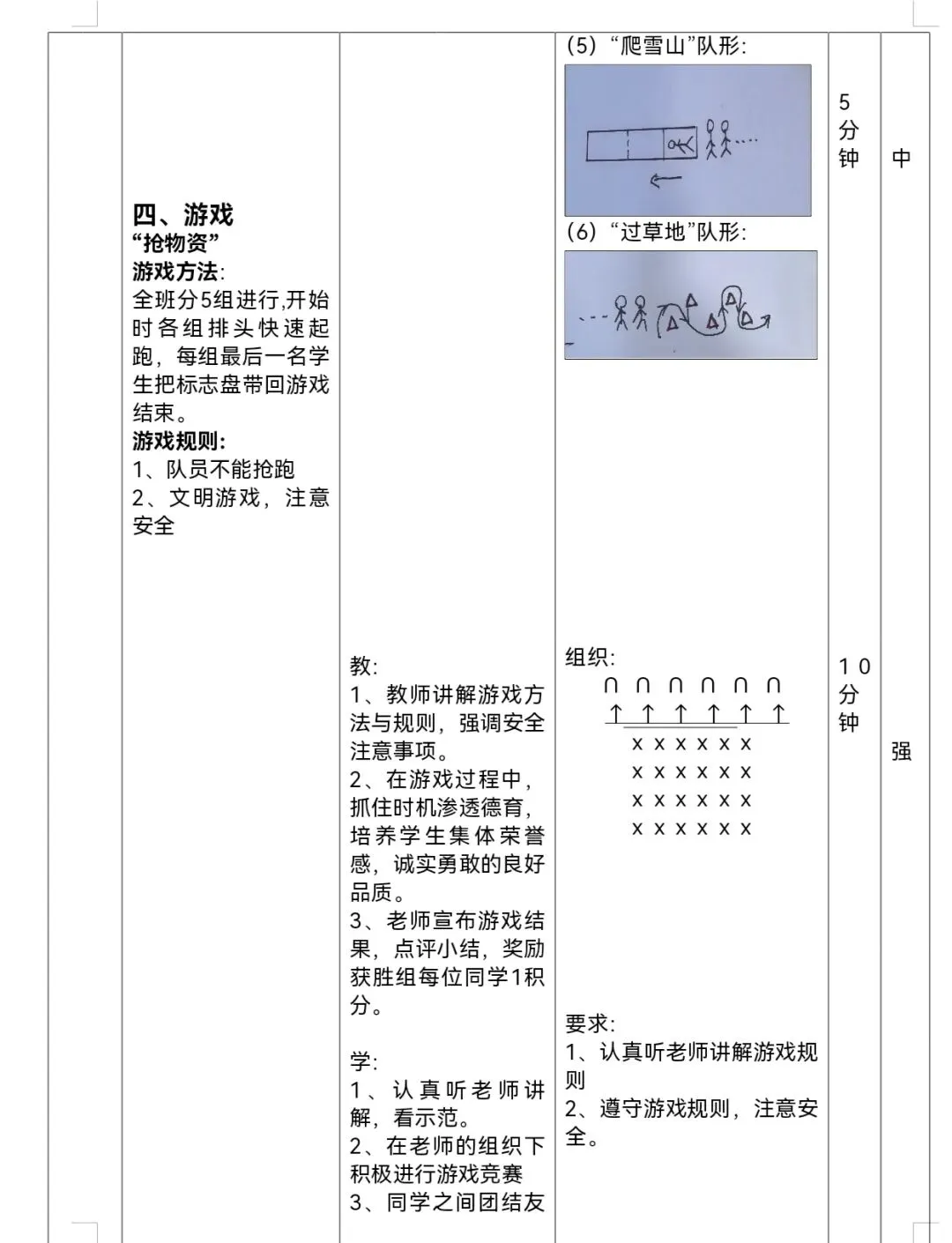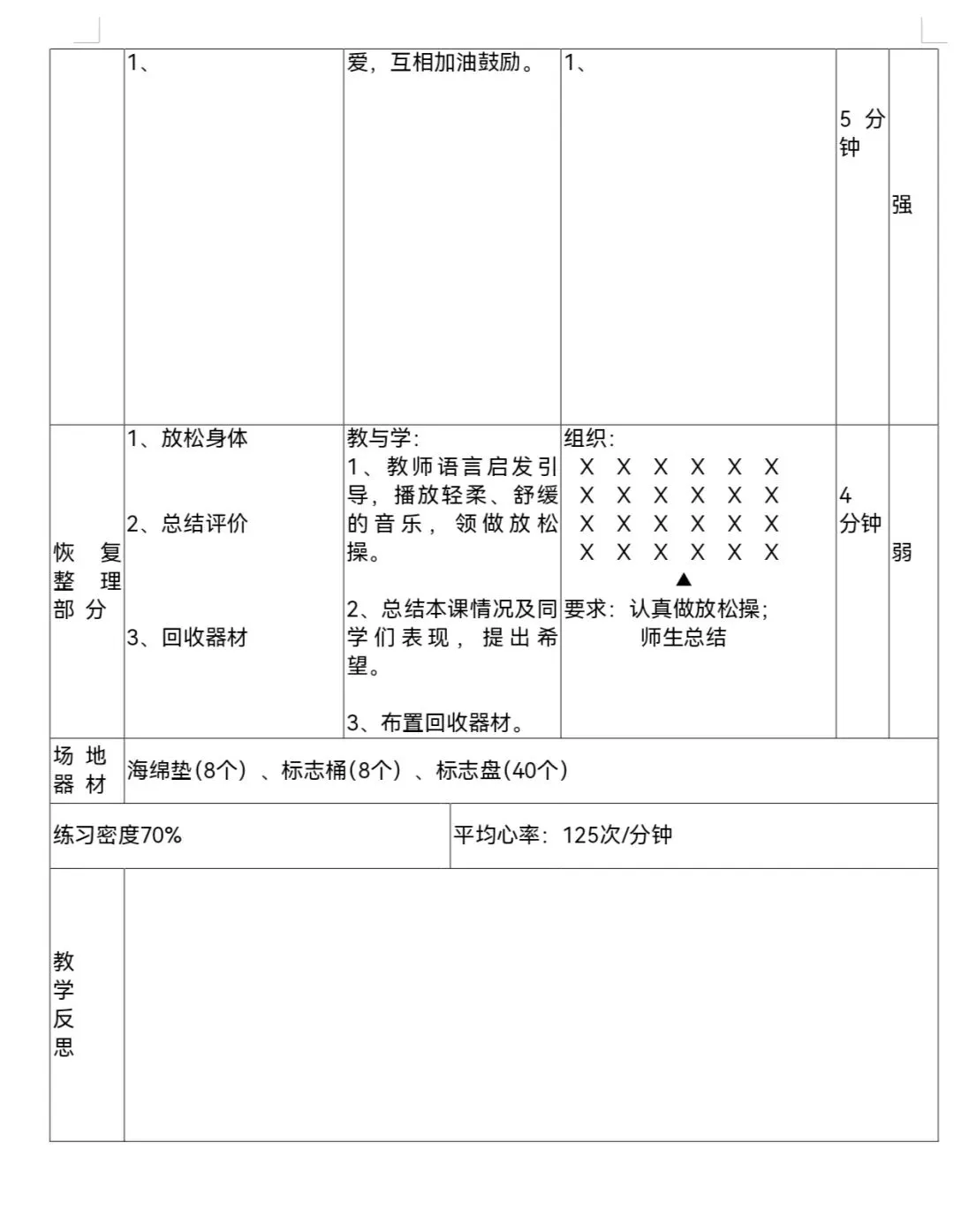 2.预计本节课学生的运动强度为中等,最高心率为145次/分左右,平均心率为125次/分左右,练习密度为70%左右。