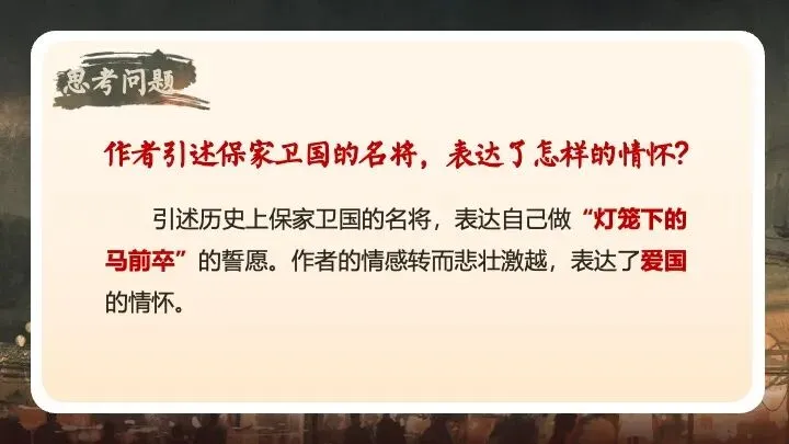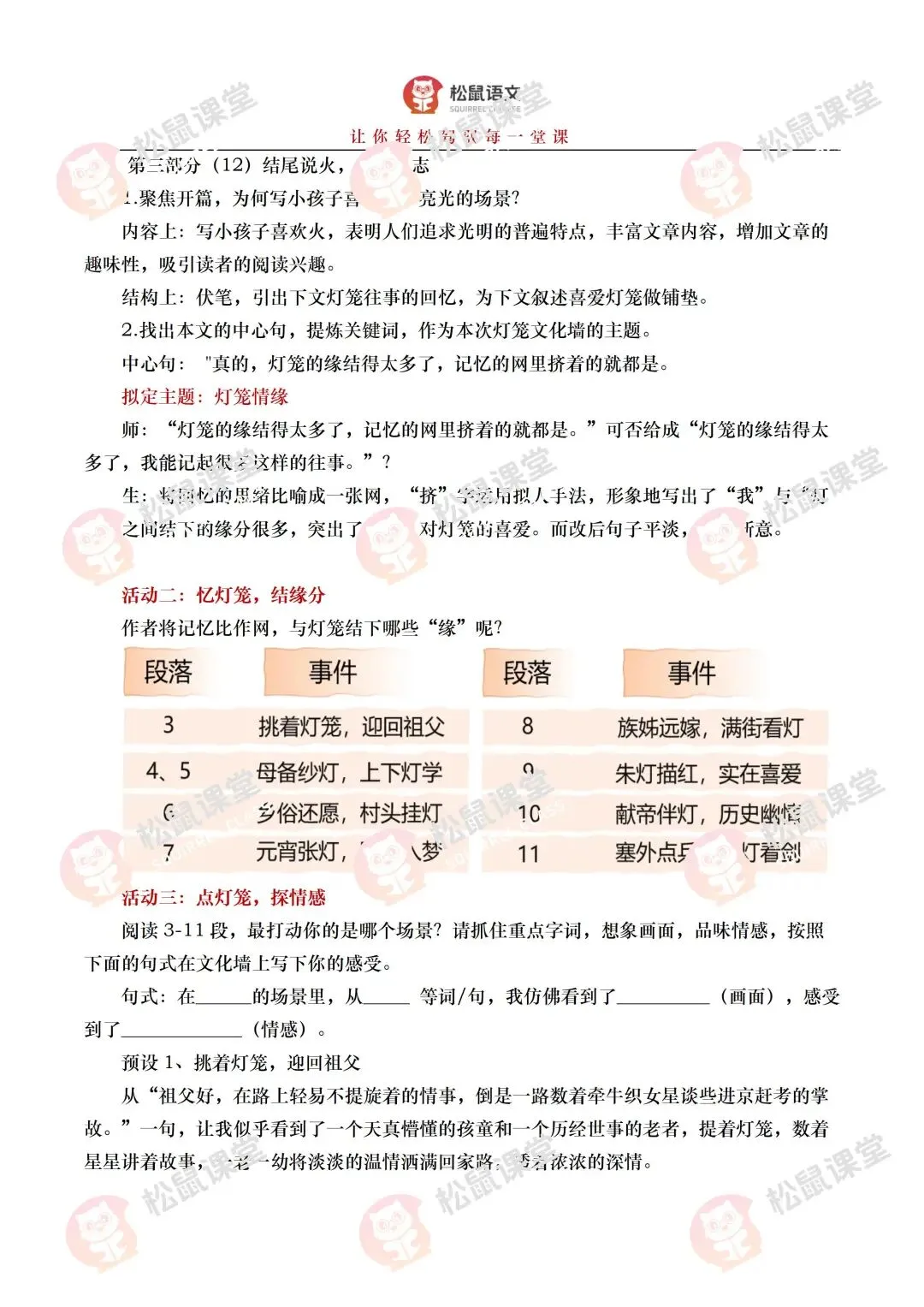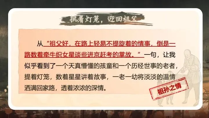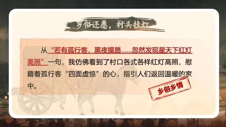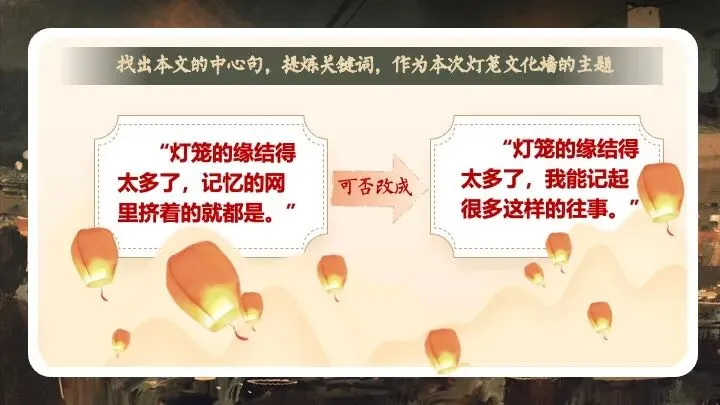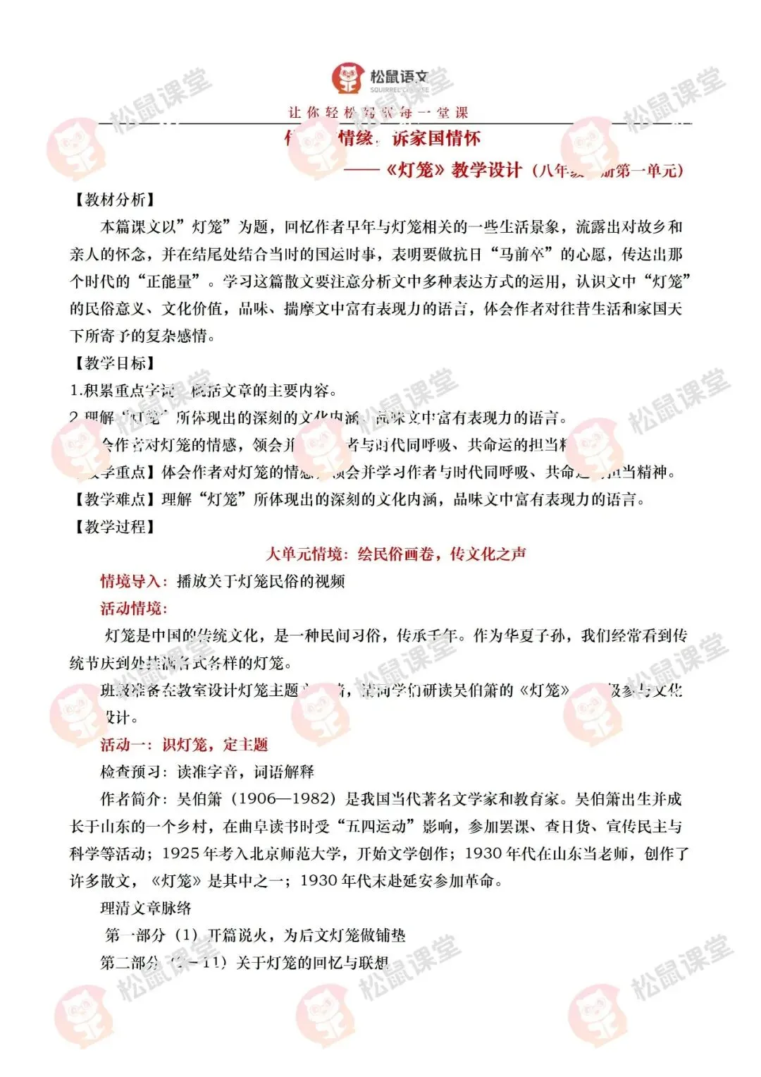本篇课文以”灯笼”为题,回忆作者早年与灯笼相关的一些生活景象,流露出对故乡和亲人的怀念,并在结尾处结合当时的国运时事,表明要做抗日“马前卒”的心愿,传达出那个时代的“正能量”。学习这篇散文要注意分析文中多种表达方式的运用,认识文中“灯笼”的民俗意义、文化价值,品味、揣摩文中富有表现力的语言,体会作者对往昔生活和家国天下所寄予的复杂感情。