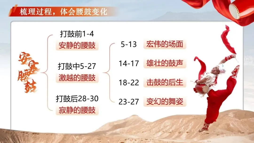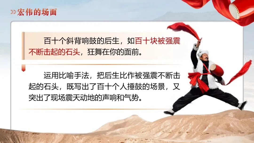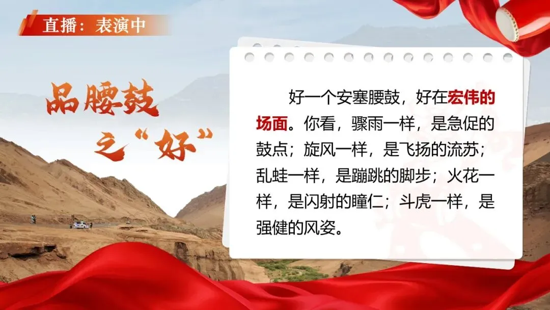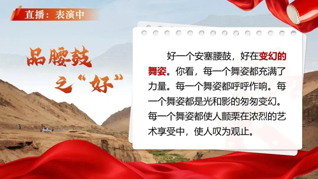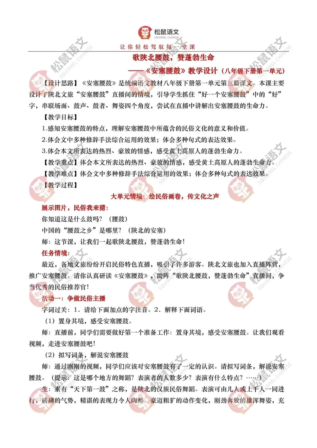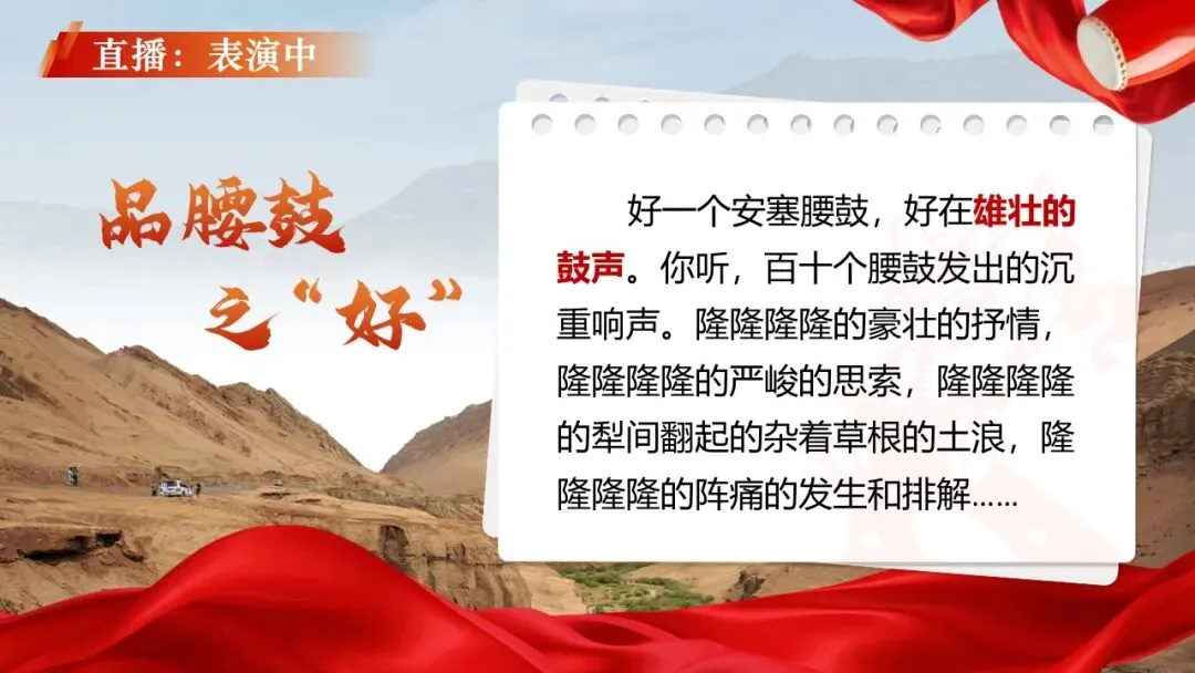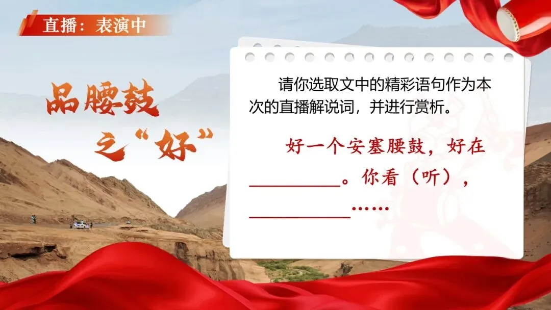 《安塞腰鼓》是统编语文教材八年级下册第一单元第三篇课文。本课主要设计了陕北文旅“安塞腰鼓”直播间的情境,引导学生抓住“好一个安塞腰鼓”中的“好”字,串联场面、鼓声、鼓者、舞姿四个角度,尝试在直播中讲解出安塞腰鼓的生命力。