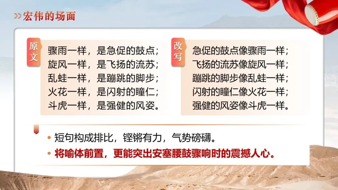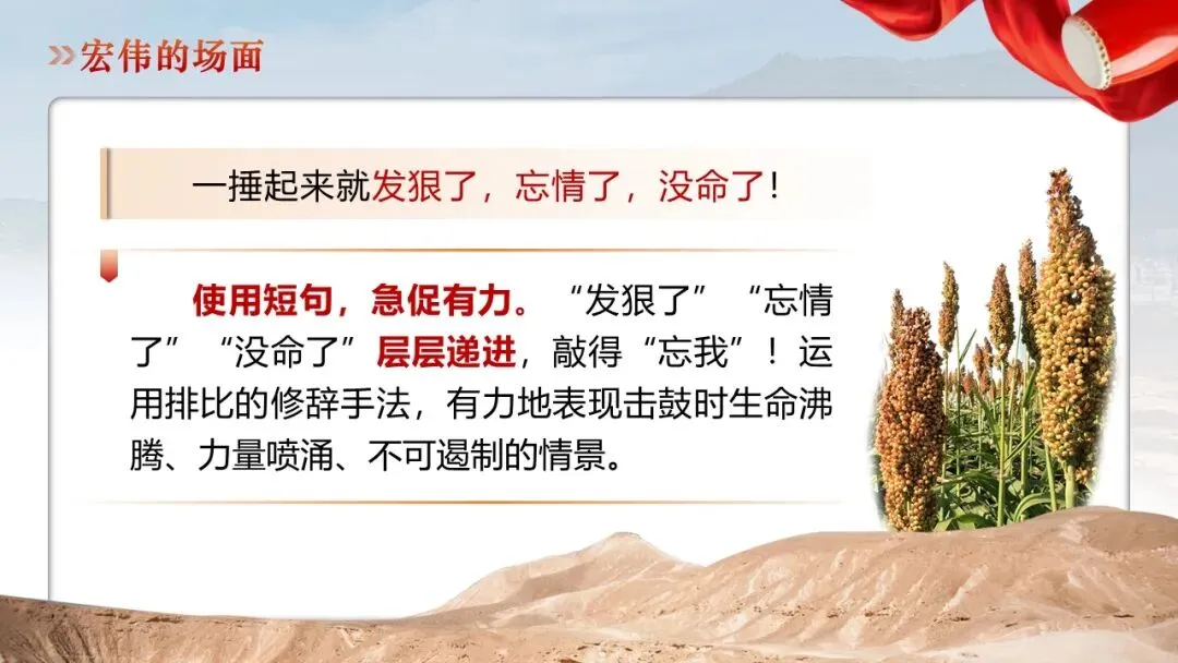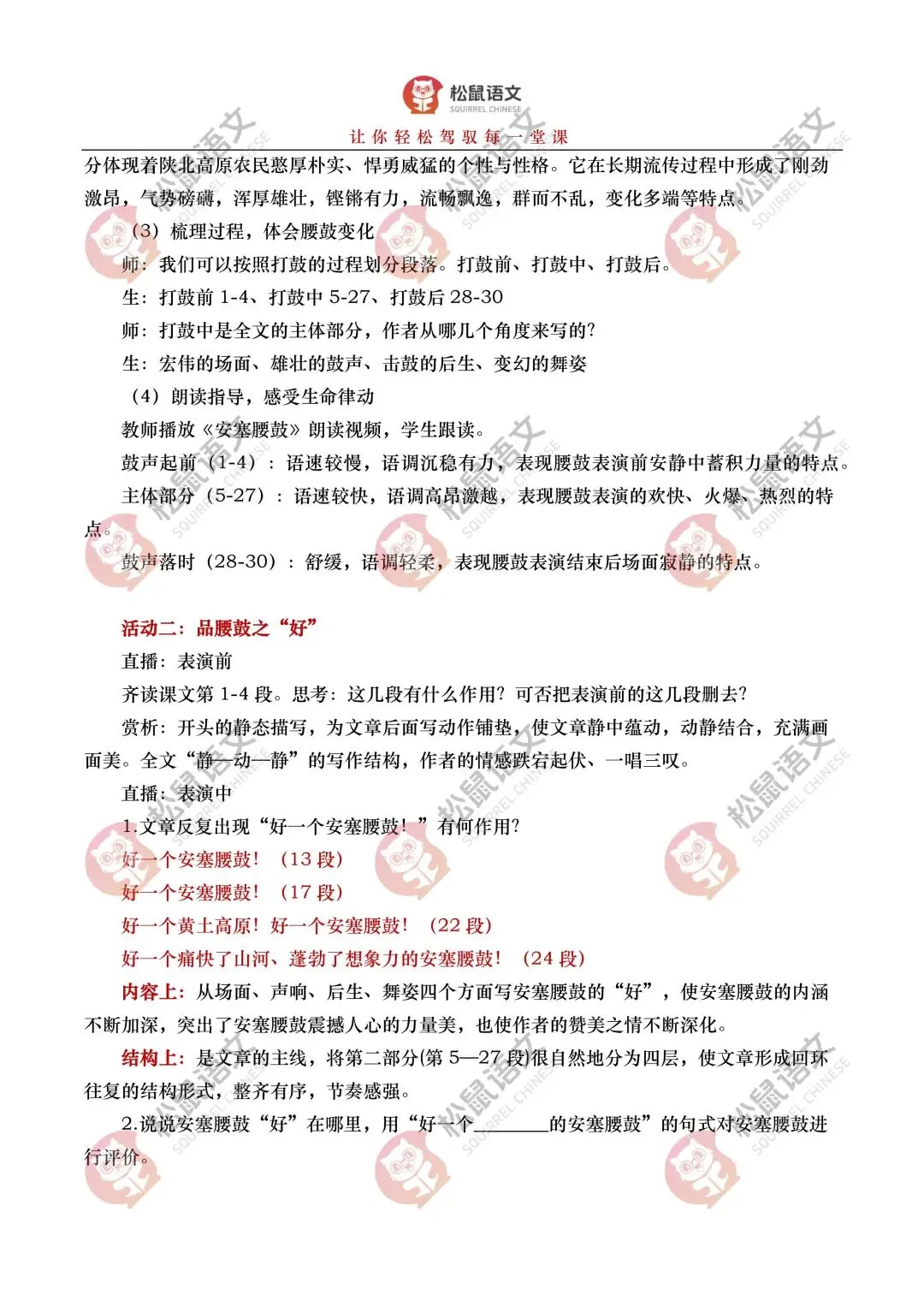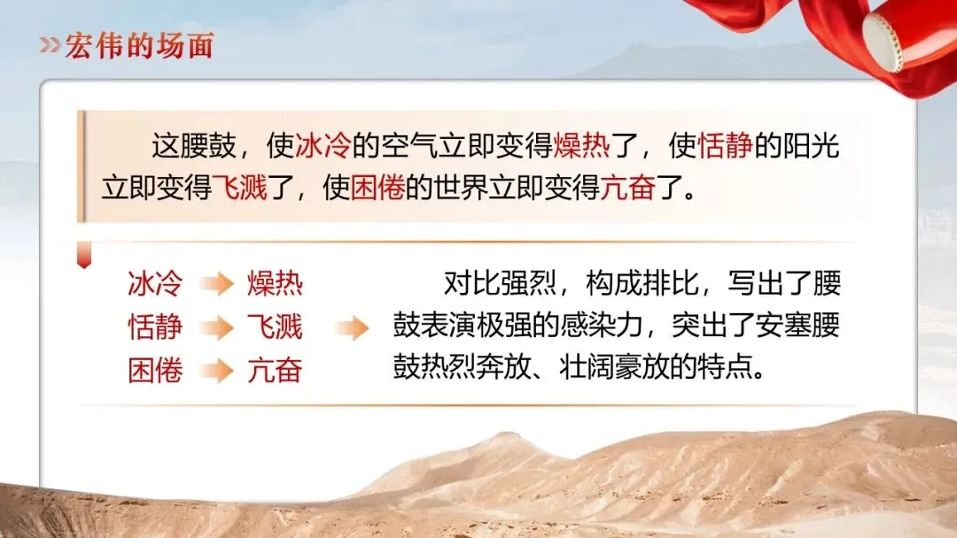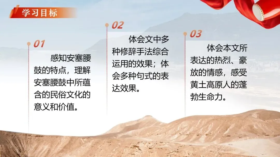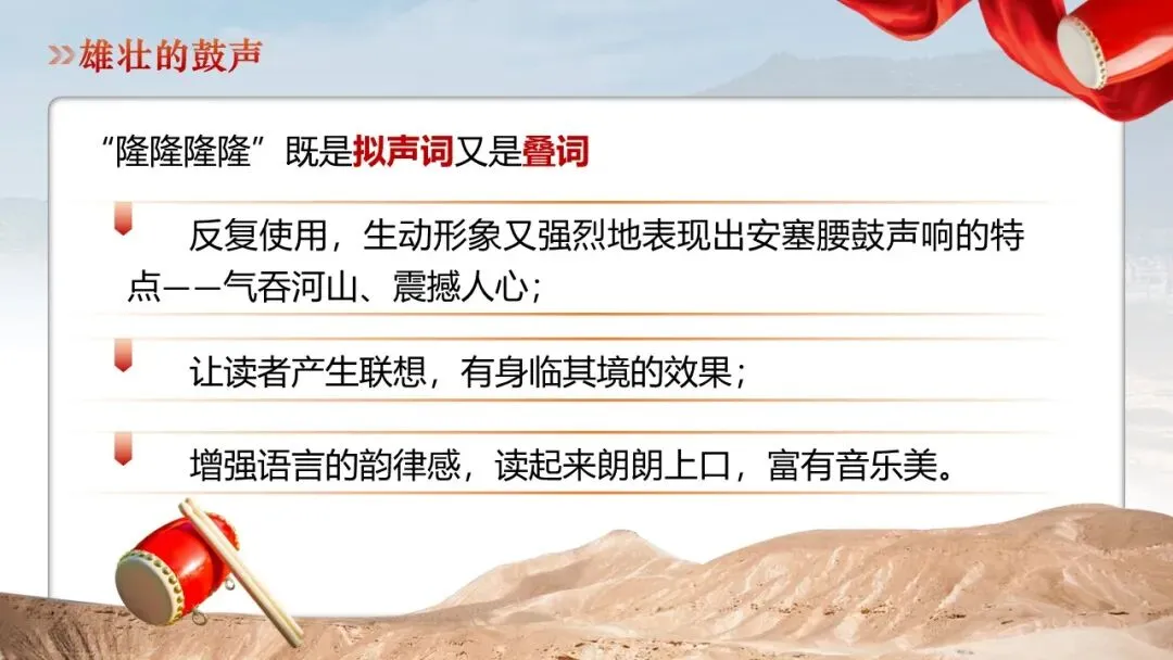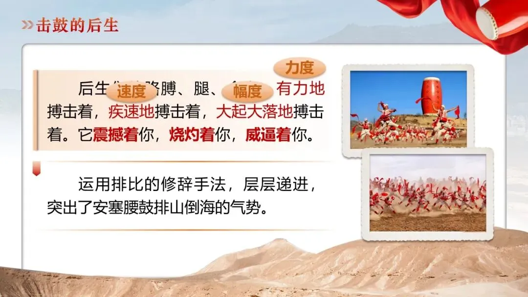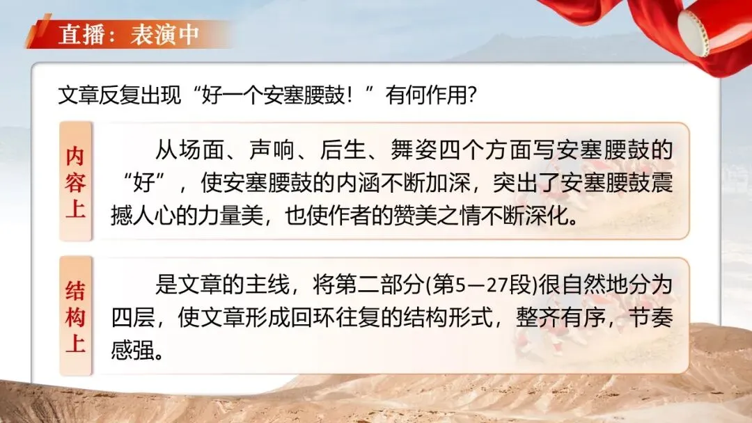 《安塞腰鼓》是统编语文教材八年级下册第一单元第三篇课文。本课主要设计了陕北文旅“安塞腰鼓”直播间的情境,引导学生抓住“好一个安塞腰鼓”中的“好”字,串联场面、鼓声、鼓者、舞姿四个角度,尝试在直播中讲解出安塞腰鼓的生命力。