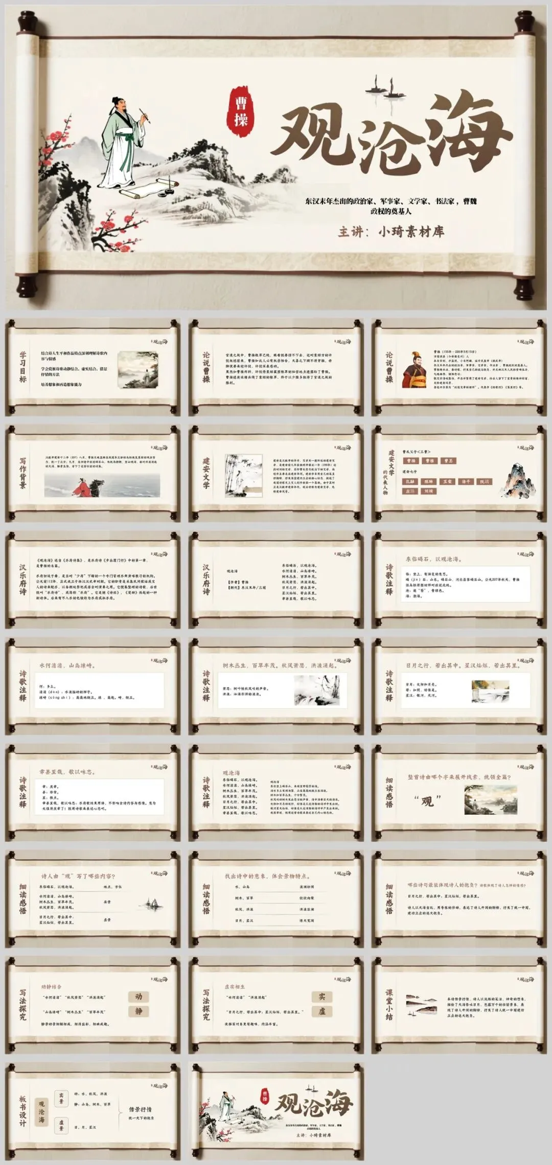 公众号改推送机制啦!点左上角蓝字小琦素材库,设置星标★,好资源不错过!然而,在曹操的《观沧海》中,我们却能感受到一种雄浑的气势和博大的胸怀。如今,为了让更多的人能够领略这首千古绝唱的魅力,一期曹操的《观沧海》初中语文课件PPT模板应运而生,一共有4套。这款课件由小琦素材库团队精心研发,以PPTX格式呈现,可编辑可修改包含2137字的教学设计,以及丰富的文字、音视频相关资料。赶紧收藏一波,必要时候真的很有用。