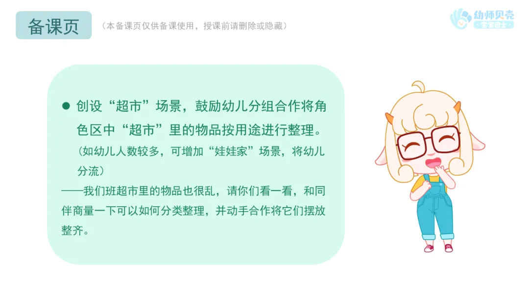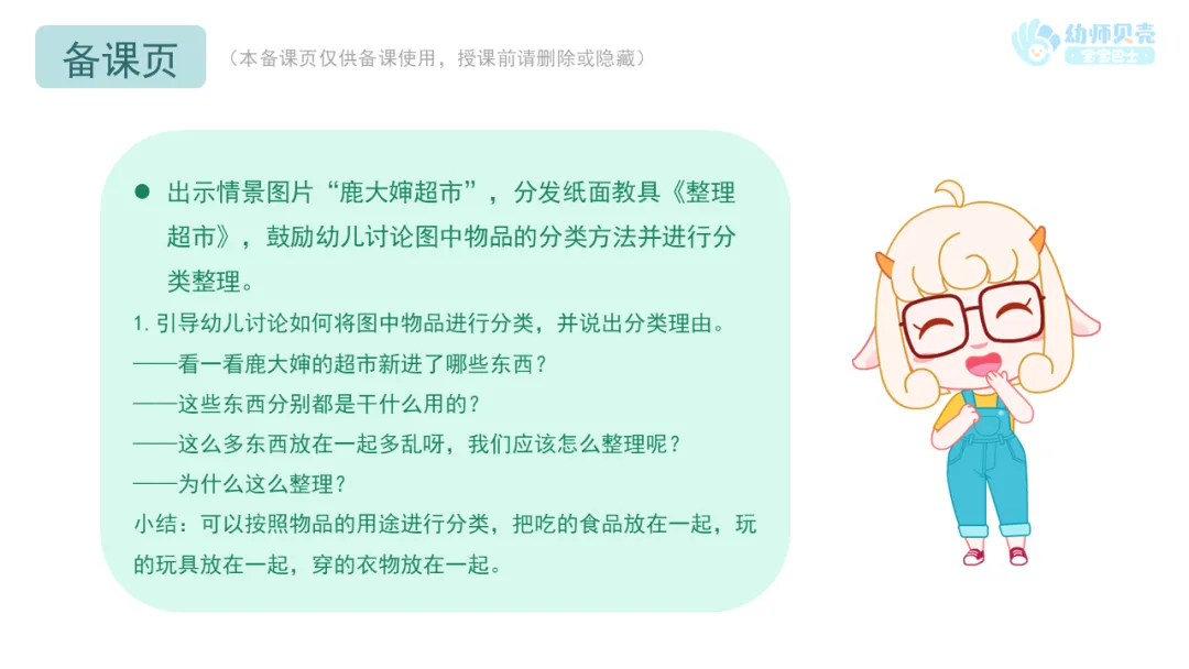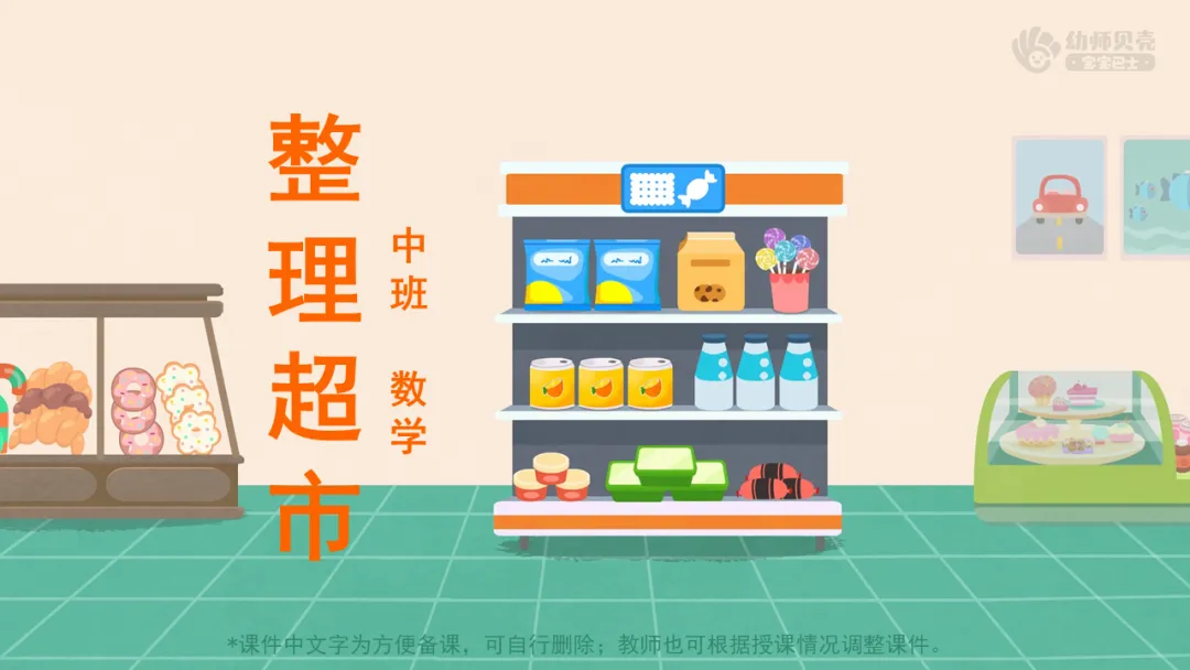 小结:原来鹿大婶的超市进了一批新货品,想请小朋友帮忙整理到货架上,我们一起去鹿大婶的超市看看吧!