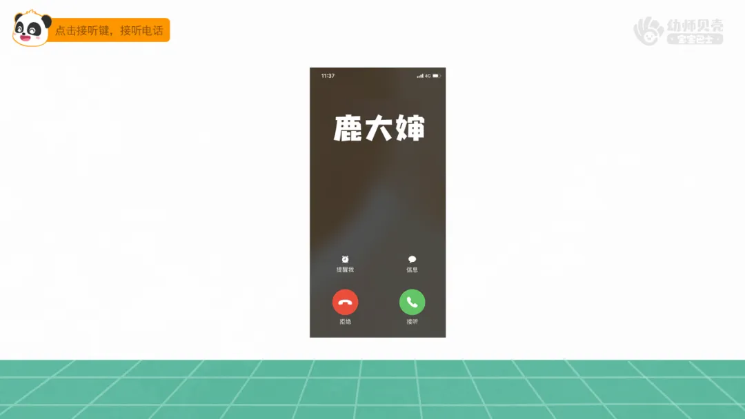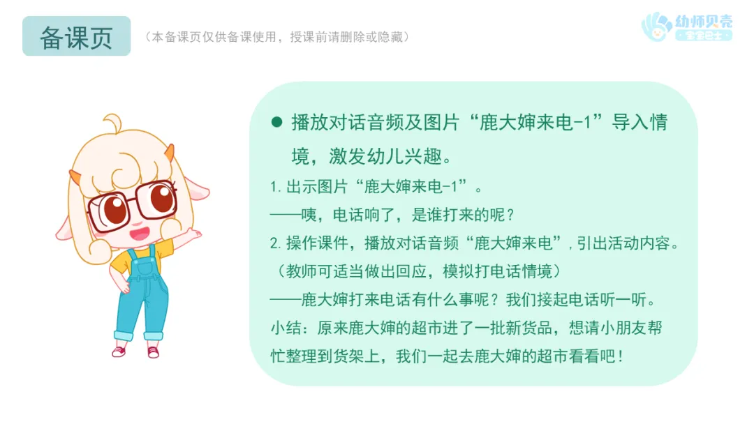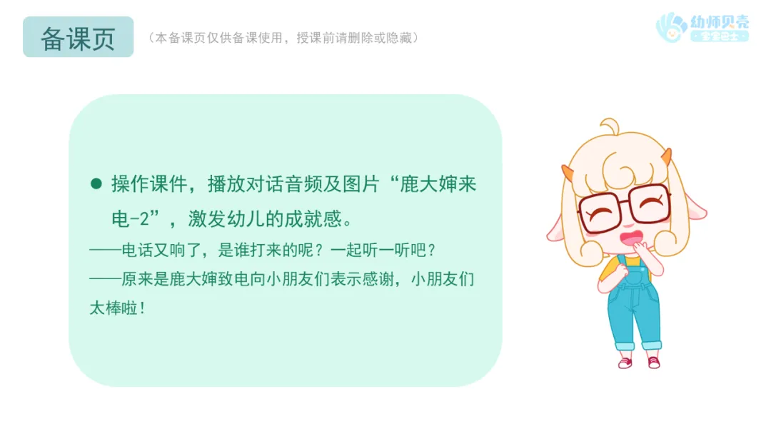 l操作课件,播放对话音频及图片“鹿大婶来电-2”,激发幼儿的成就感。
