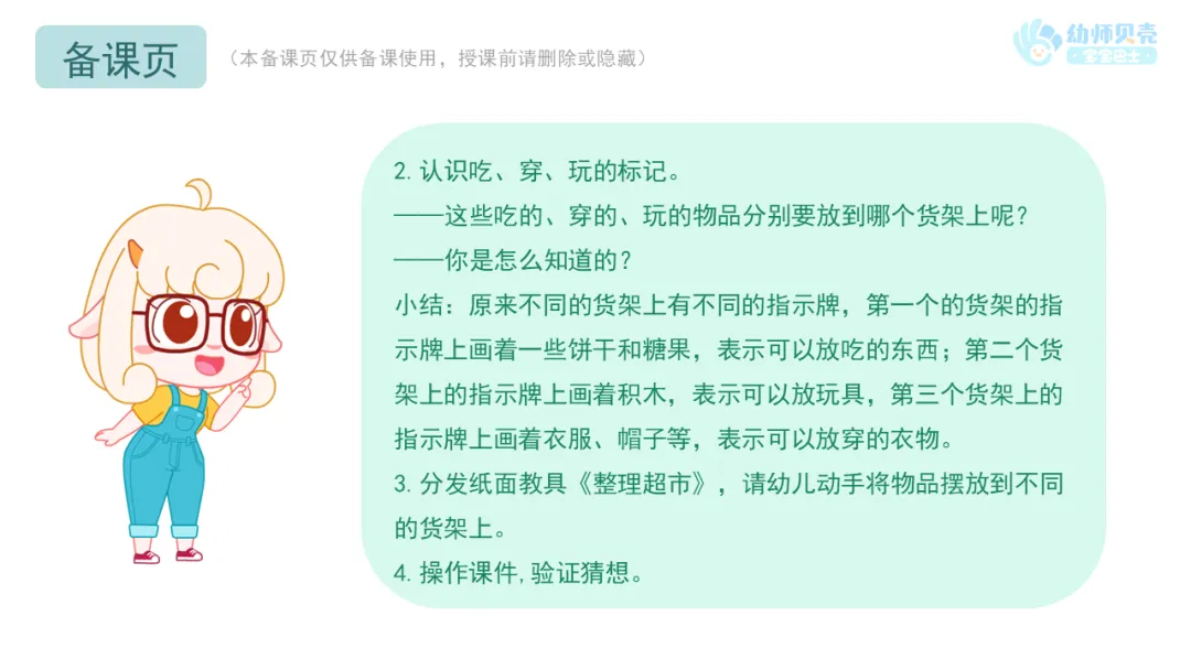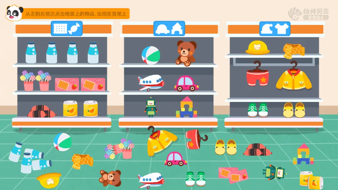 小结:原来不同的货架上有不同的指示牌,第一个的货架的指示牌上画着一些饼干和糖果,表示可以放吃的东西;第二个货架上的指示牌上画着积木,表示可以放玩具,第三个货架上的指示牌上画着衣服、帽子等,表示可以放穿的衣物。