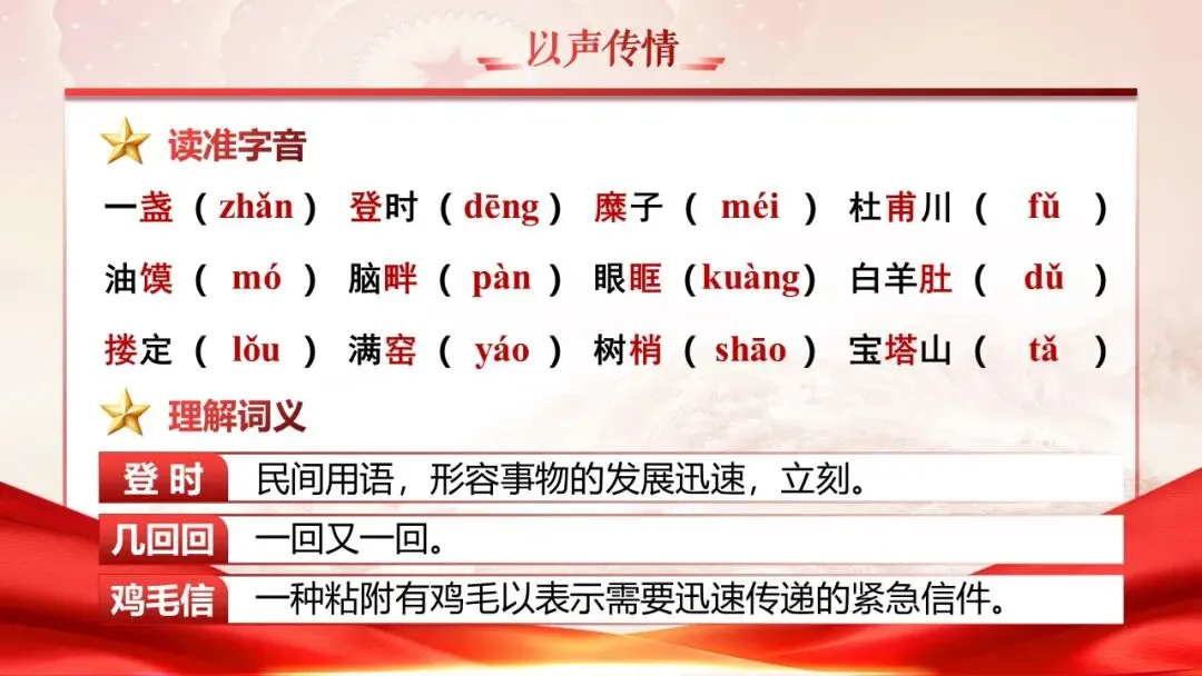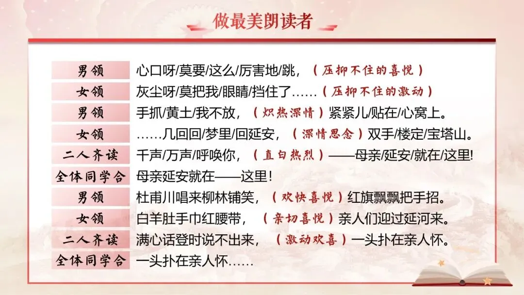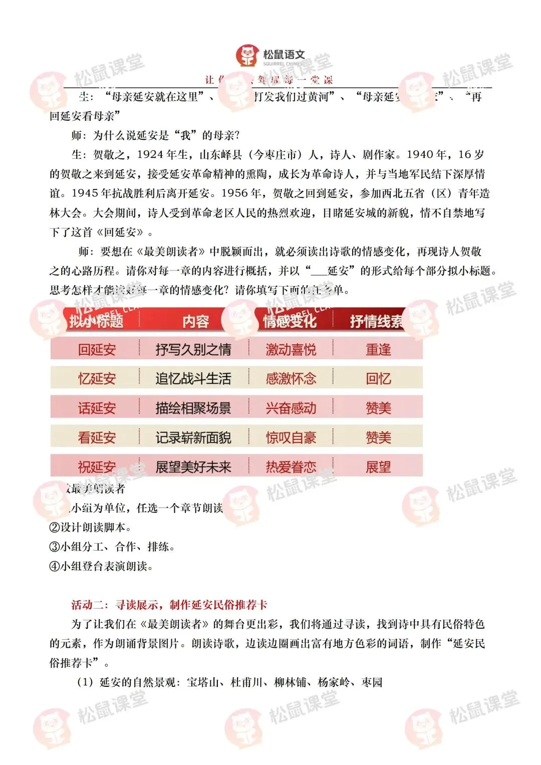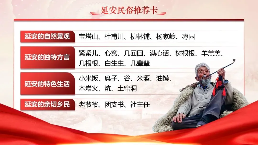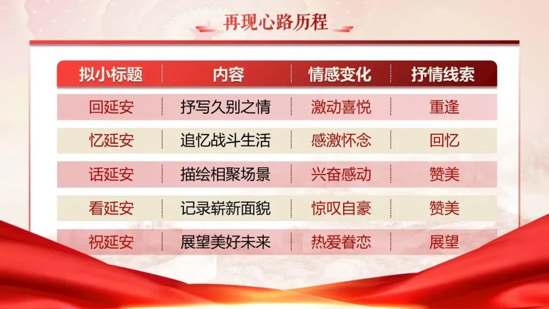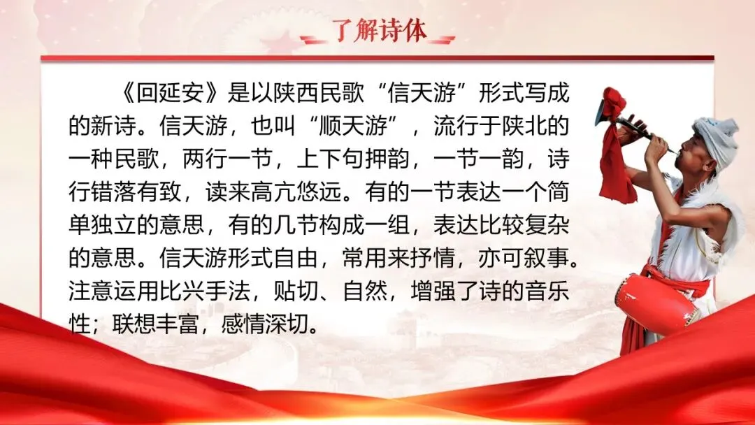 《回延安》是统编语文教材八年级下册第一单元第二篇课文,是中国著名作家贺敬之的一篇现代诗。作者用陕北民歌“信天游”的形式写成,使用了富有地方色彩的词语,展示出浓郁的陕北风情。通过叙写回延安的所见、所闻、所忆、所感,以赤诚之心歌颂了养育一代革命者的延安精神,也表达了对延安炽热的眷恋和赞美之情。