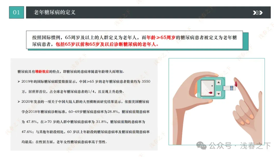 年龄≥65周岁的糖尿病患者被定义为老年糖尿病患者,包括65岁以前和65岁及以后诊断糖尿病的老年人。