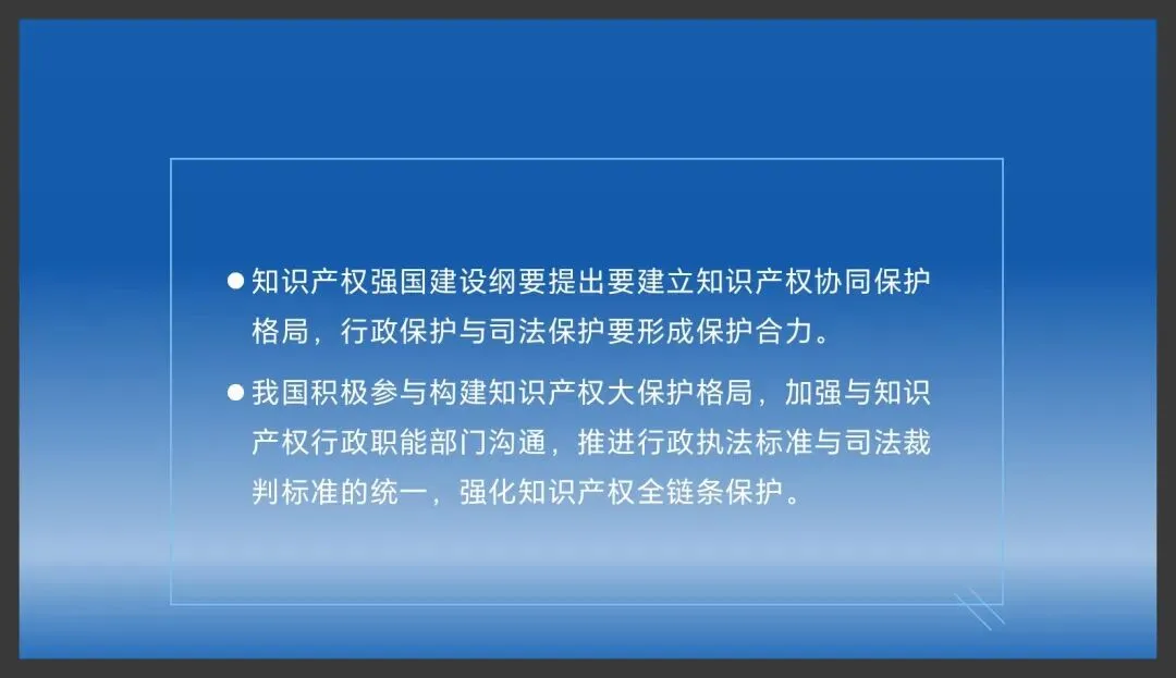 知识产权强国建设纲要提出要建立知识产权协同保护格局,行政保护与司法保护要形成保护合力。我国积极参与构建知识产权大保护格局,加强与知识产权行政职能部门沟通,推进行政执法标准与司法裁判标准的统一,强化知识产权全链条保护。