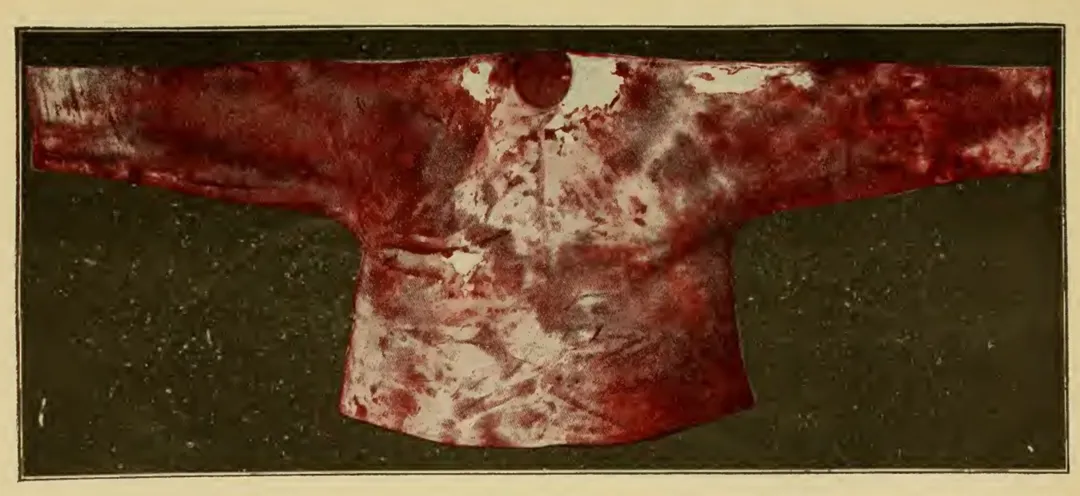 能方济神父的内衣(按中国式样裁剪,非常宽大,袖子长过手掌)完全被鲜血浸透;图中颜色较深的斑块是血迹,随着时间推移实际已变成褐色。