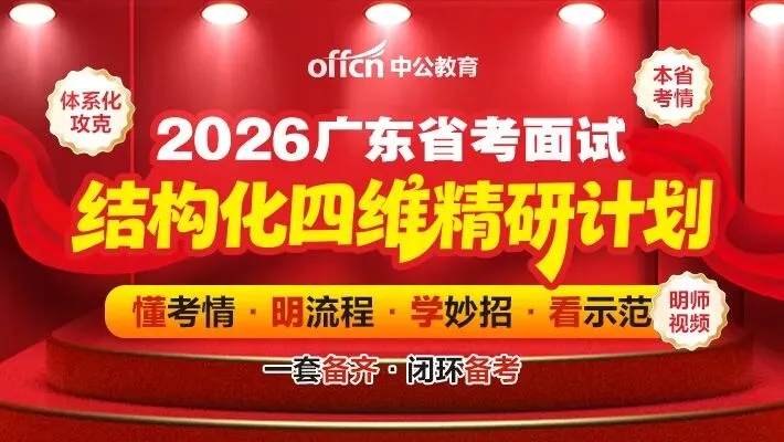 《2026广东省考面试结构化四维精研计划》,根据广东省命题本土化的特色会结合粤港澳大湾区、基层治理、民生热点出题。从4个维度出发,带你懂考情·明流程·学妙招·看示范。