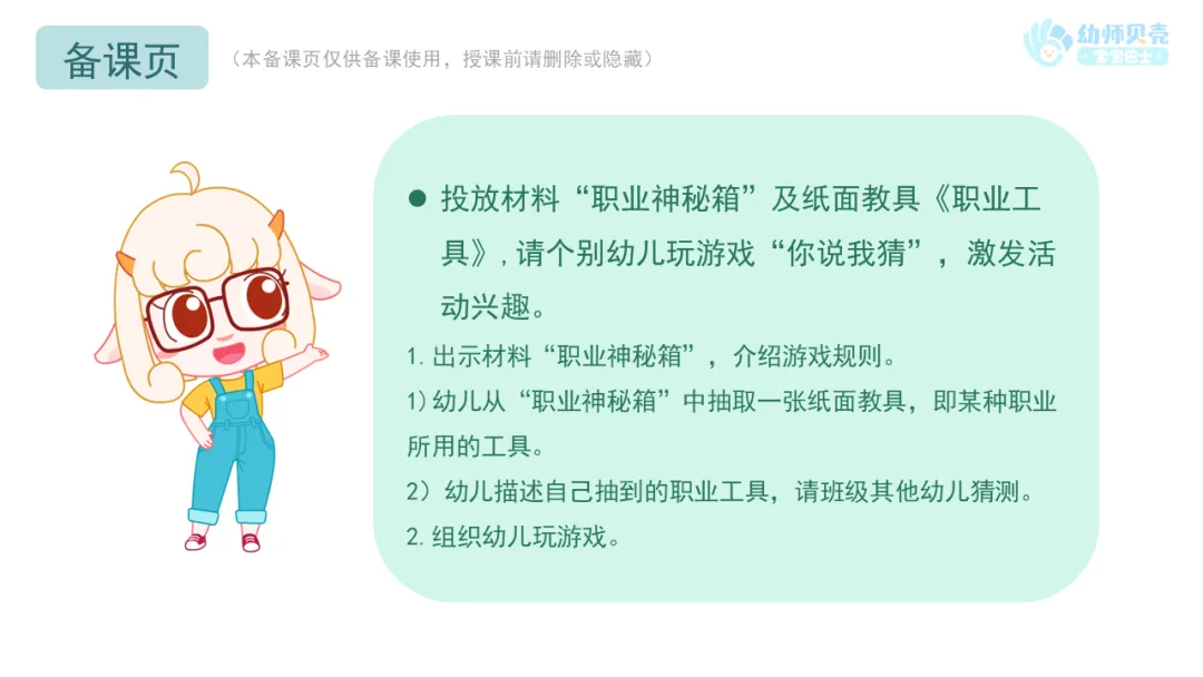 l投放材料“职业神秘箱”及纸面教具《职业工具》,请个别幼儿玩游戏“你说我猜”,激发活动兴趣。