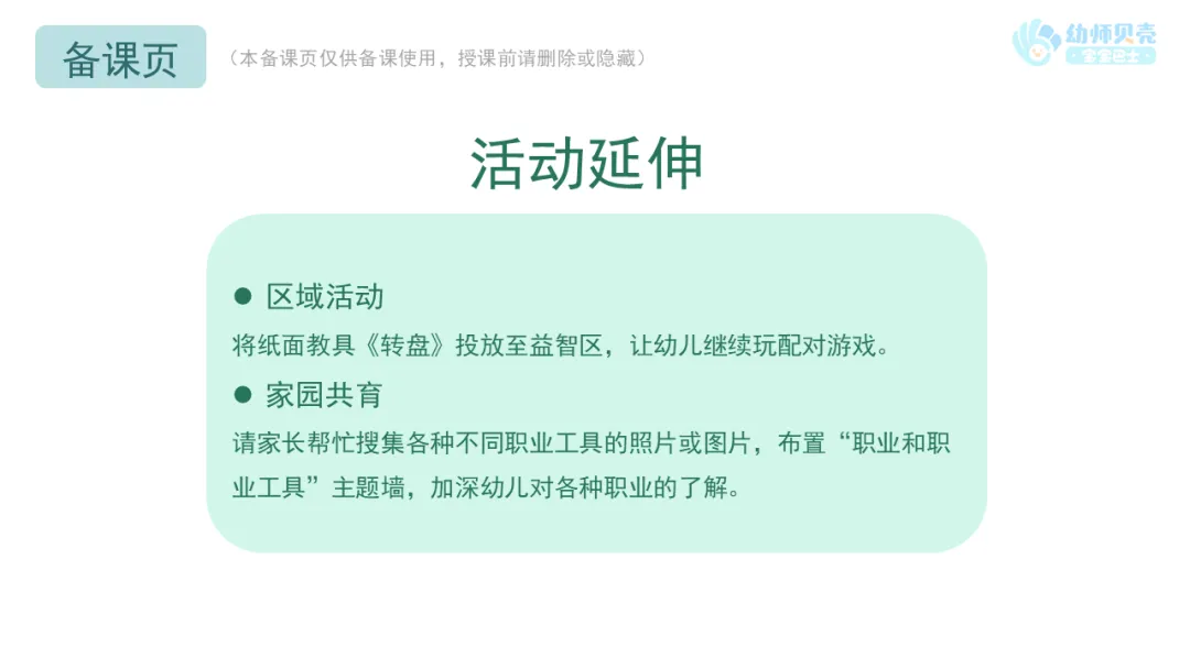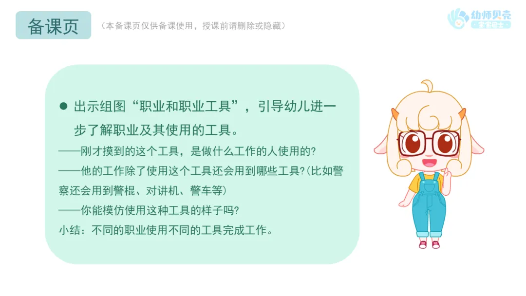 l经验准备:幼儿对生活中常见的职业及其使用的工具有初步的认识。