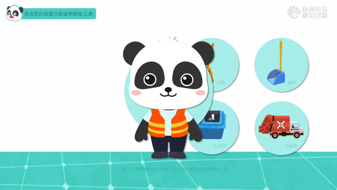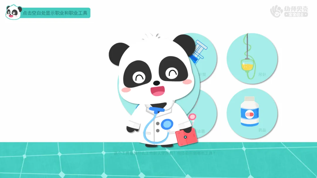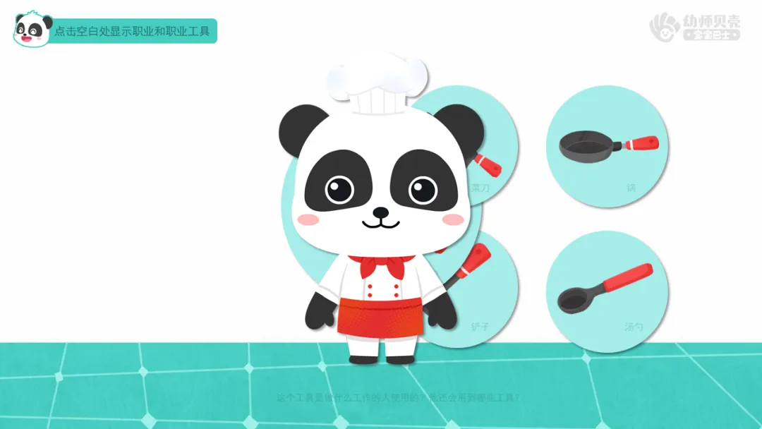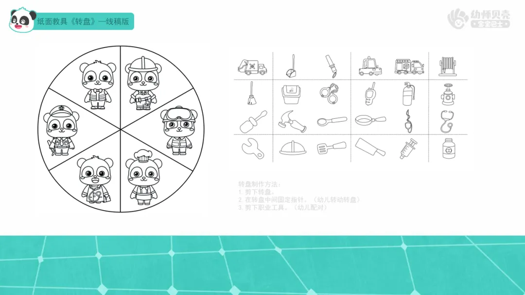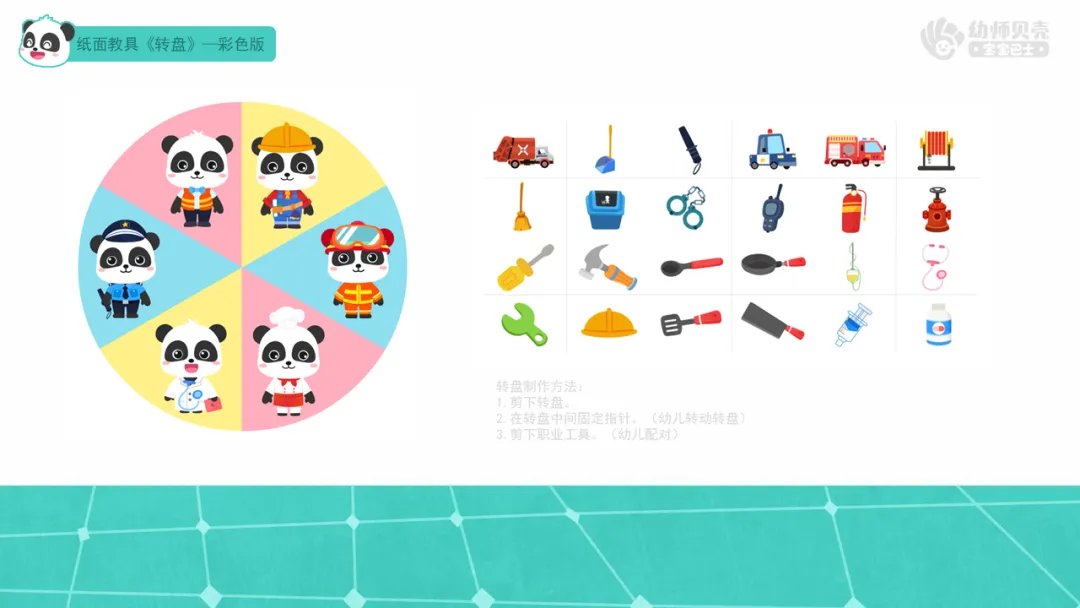 l出示纸面教具《转盘》,带领幼儿玩职业和工具配对的游戏,加深对各种职业所使用工具的了解。