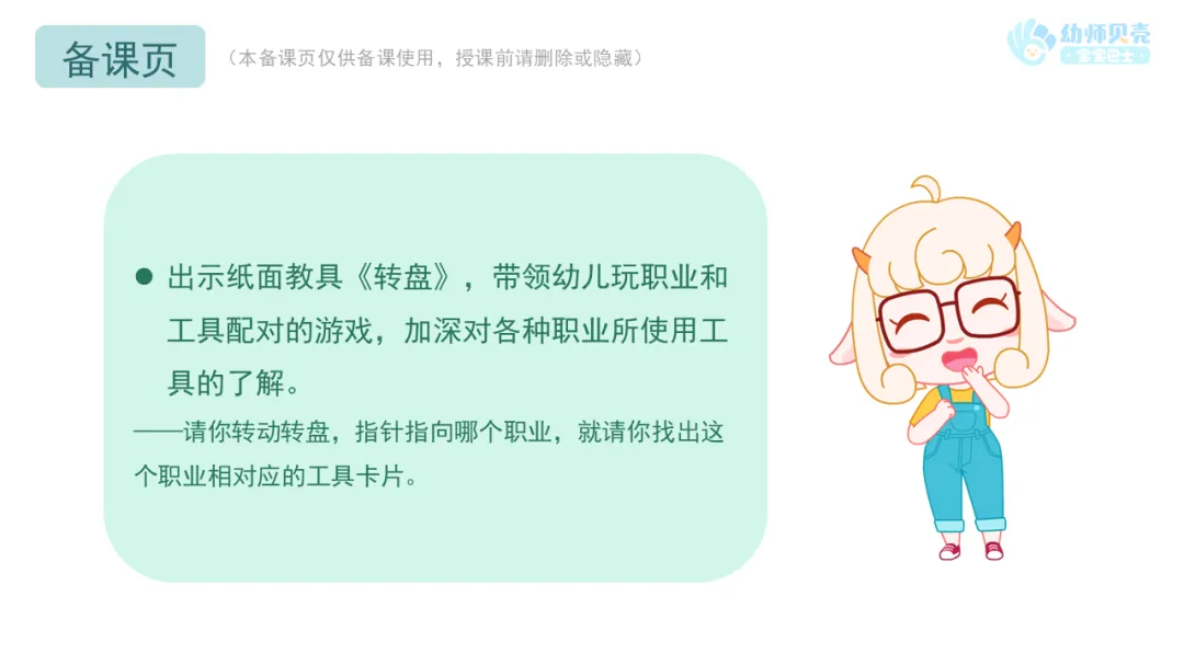 ——请你转动转盘,指针指向哪个职业,就请你找出这个职业相对应的工具卡片。