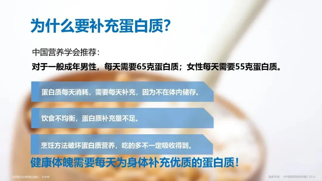我们看看每天应该补充多少蛋白质?中国营养学会推荐:对于一般成年男性,每天需要65克蛋白质;女性每天需要55克蛋白质。而大多数人膳食营养不均衡,很难每天都达标。