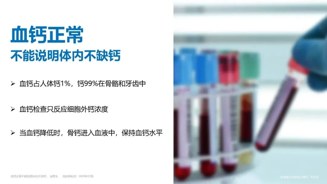 第二个问题:很多朋友说我去抽血化验的时候不缺钙,是不是就不用补钙?那么血钙真的能够准确的反应我们是否缺钙么?