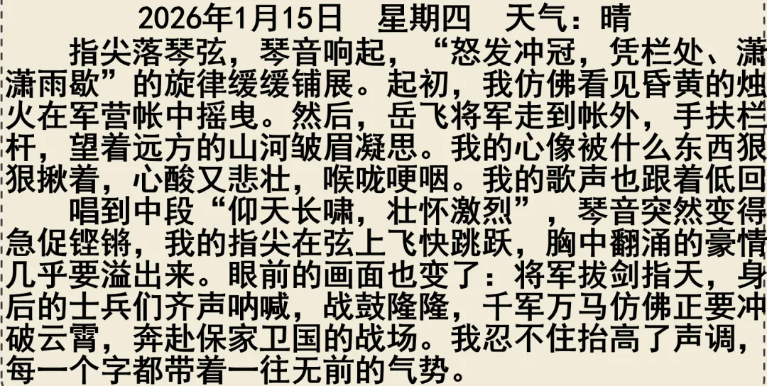 2.音乐导入:教师现场弹奏古琴《满江红》选段,随后展示自己撰写的音乐日记,提问:“同学们读一读老师的日记,评一评写得怎么样?”