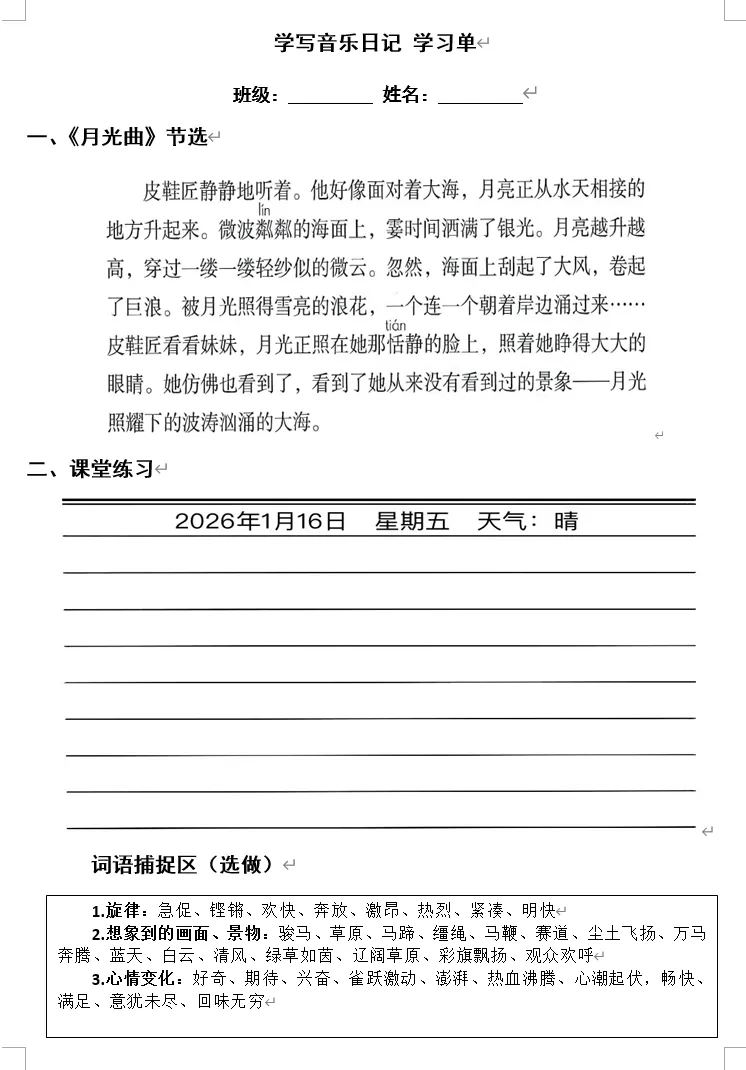 2.学习单:包含《月光曲》选段文本、写作方法提示、互评标准。