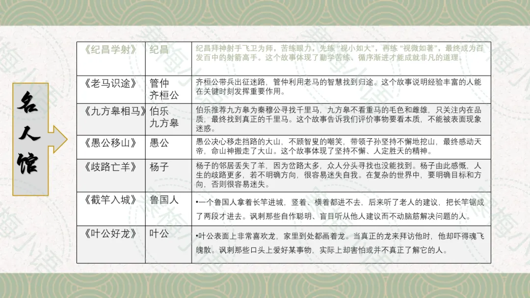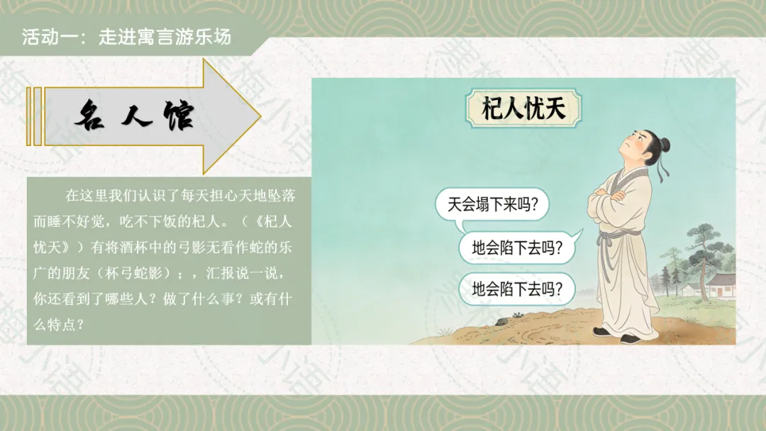 1. 名人馆:在这里我们认识了每天担心天地坠落而睡不好觉,吃不下饭的杞人。(《杞人忧天》)有将酒杯中的弓影无看作蛇的乐广的朋友(杯弓蛇影);,汇报说一说,你还看到了哪些人?做了什么事?或有什么特点?