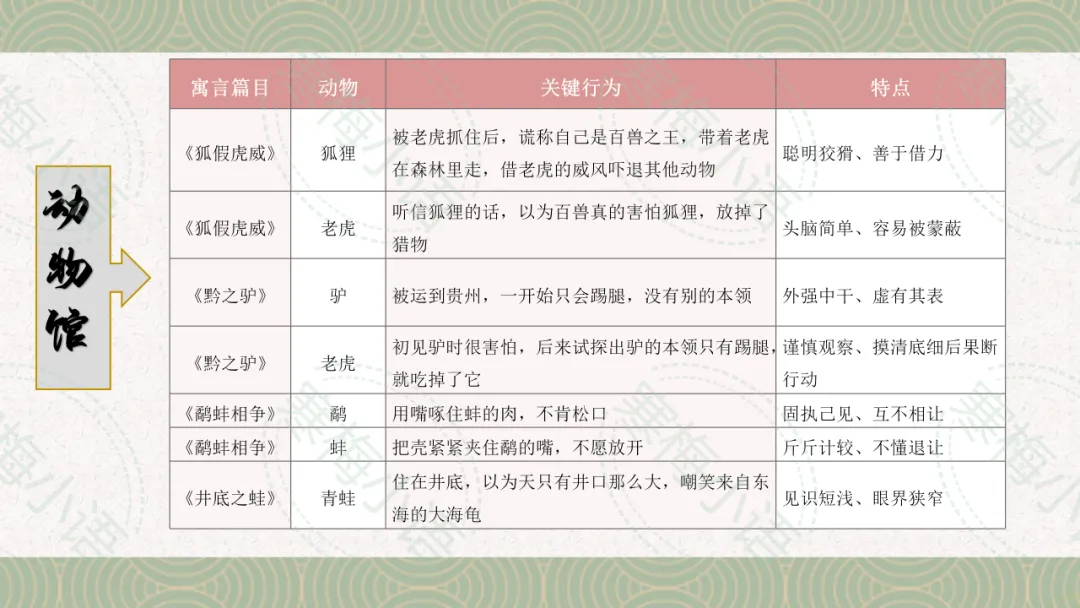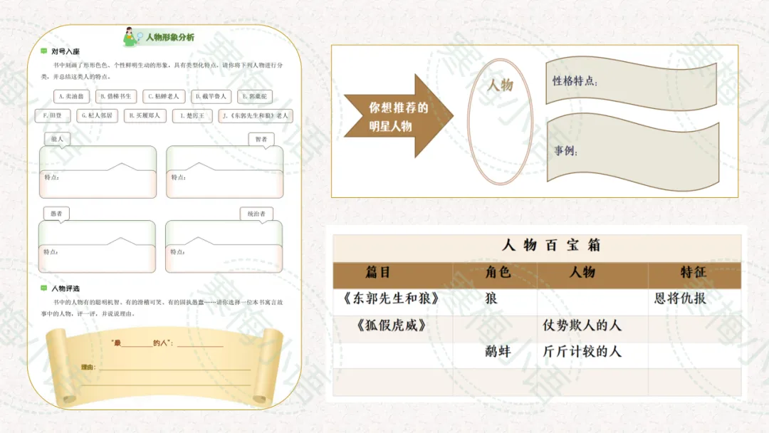 1.精彩片段朗读:选取书中语言生动的片段(如《狐假虎威》中狐狸欺骗老虎的对话),组织学生分组朗读、齐读,感受寓言简洁、形象的语言特点。