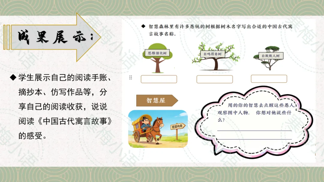 2. 成果展示:学生展示自己的阅读手账、摘抄本、仿写作品等,分享自己的阅读收获,说说阅读《中国古代寓言故事》的感受。