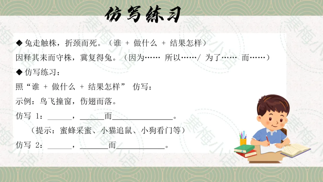 “读了《守株待兔》,我知道了宋国农夫因为捡了一次撞死的兔子,就天天坐在树桩旁等,最后田都荒了。以前我写作业总想着‘明天再补’,或者考试前想‘蒙几道题就能得分’,现在我明白啦 —— 好成绩不是‘等’来的,得每天认真写作业、复习,就像农夫得好好耕田才会有收成。上周我坚持每天预习语文,这次小测成绩真的提高了!”