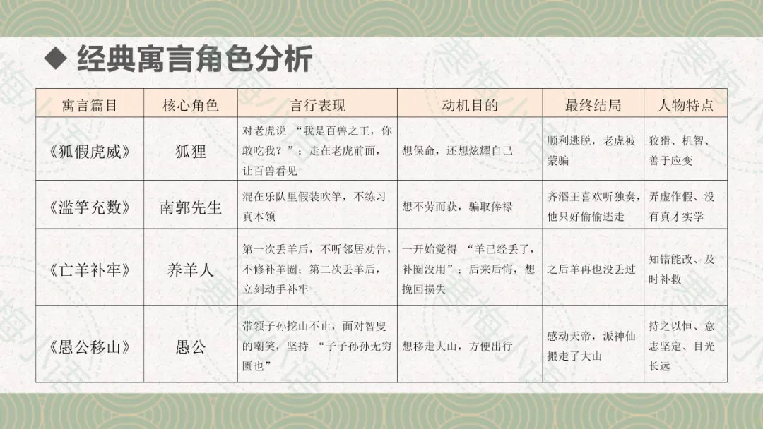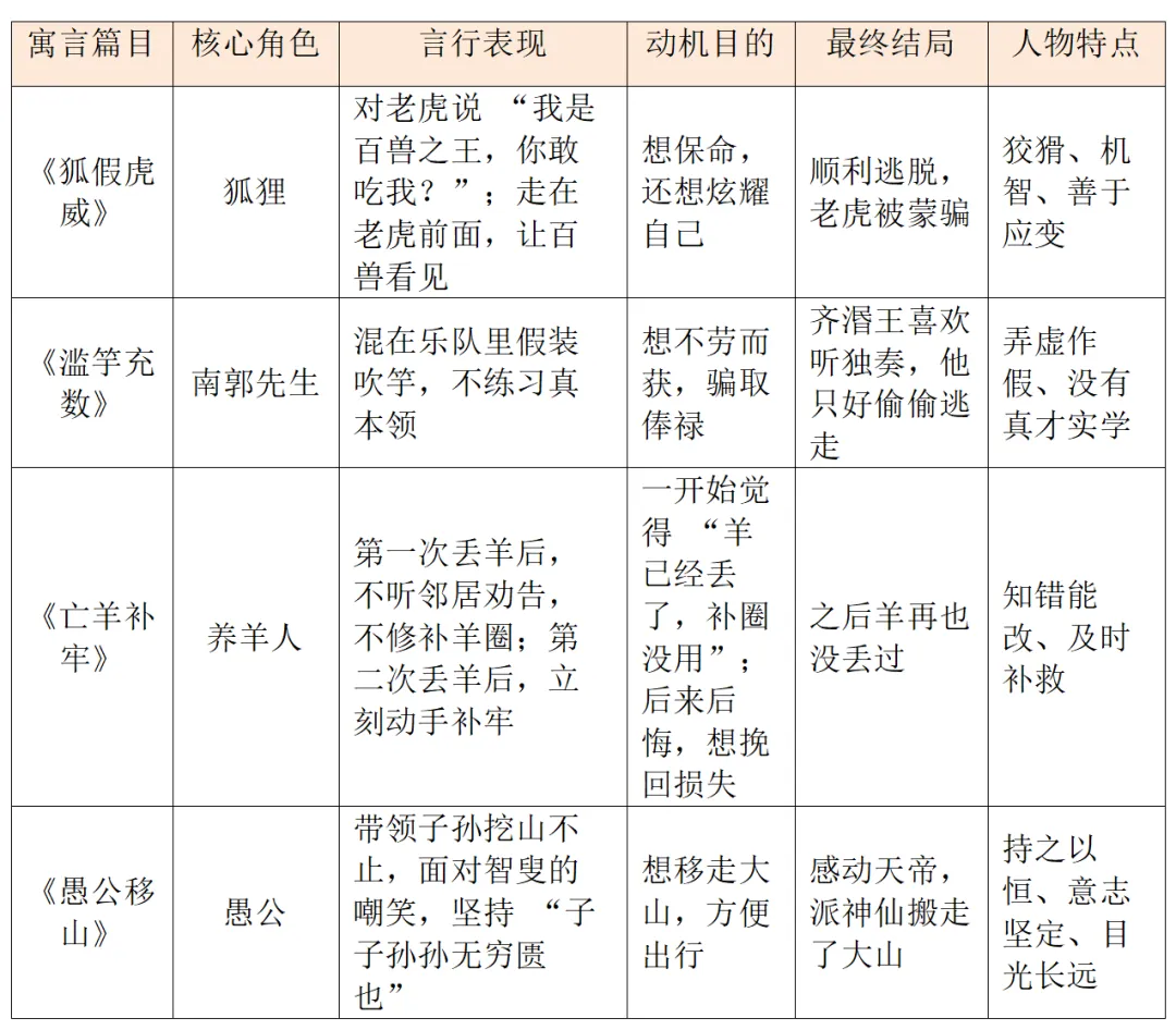 将学生分为 4 组,每组分配一个经典寓言及角色,合作完成分析表: