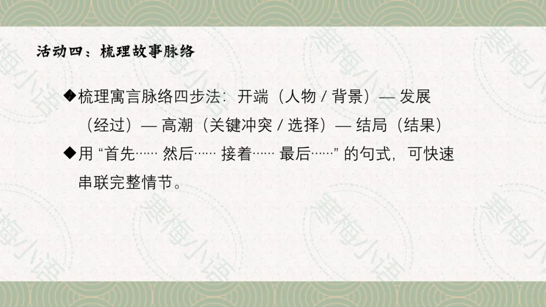 同学们,上节课我们推开了寓言世界的大门,学会了读寓言的 “三步法”,今天,我们要变身 “寓言智慧探索家”,一起深入挖掘寓言背后的秘密:怎么从不同角度看懂故事里的道理?怎么把零散的情节梳理清楚?怎么让寓言智慧真正帮到我们的生活?让我们带着这些问题,继续探索寓言的宝藏吧!