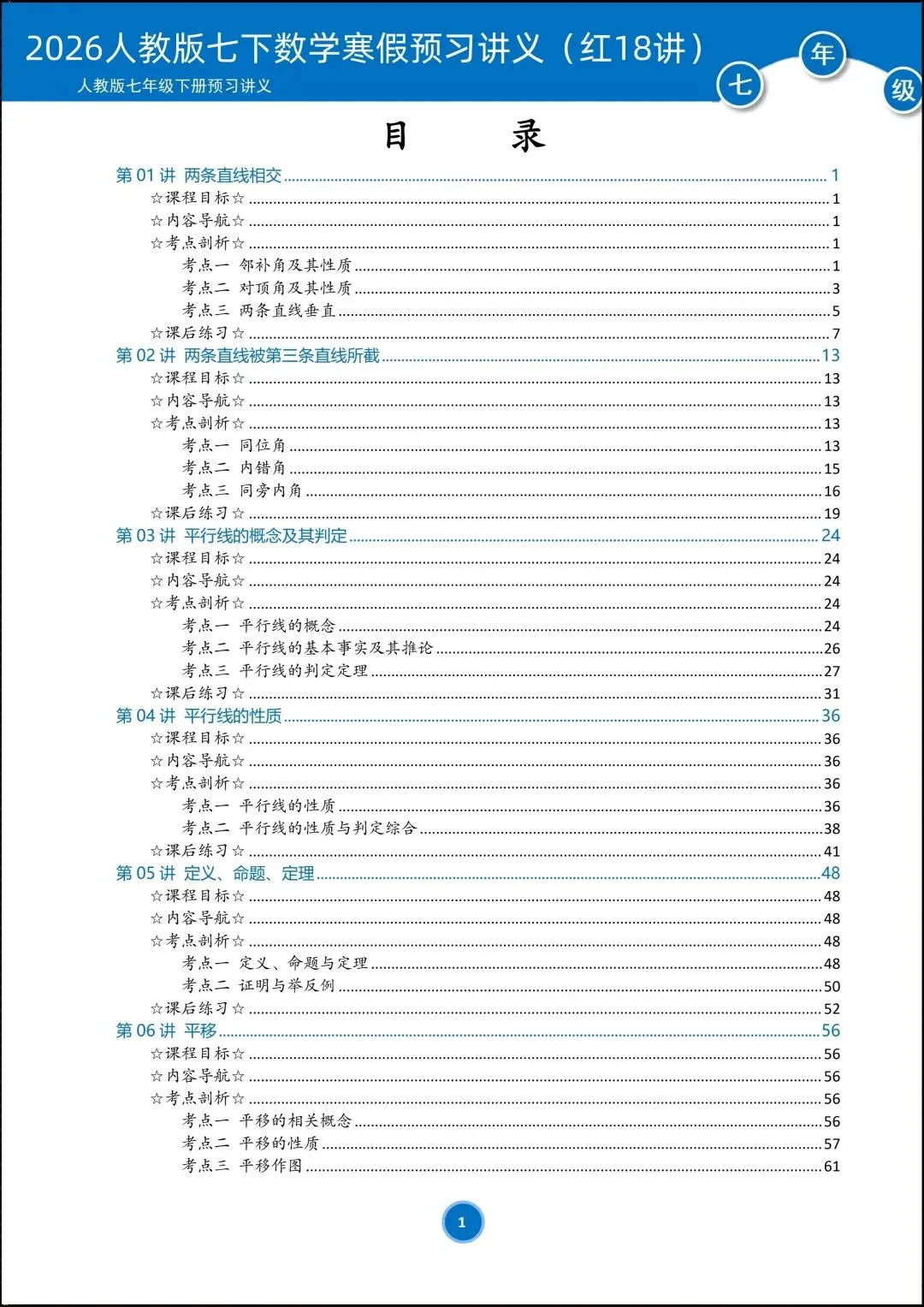 | 今日老师精心给大家整理了: 2026春新人教版七年级数学下册预习讲义(学生版+答案版)寒假预习必备,完整电子版可打印! |
