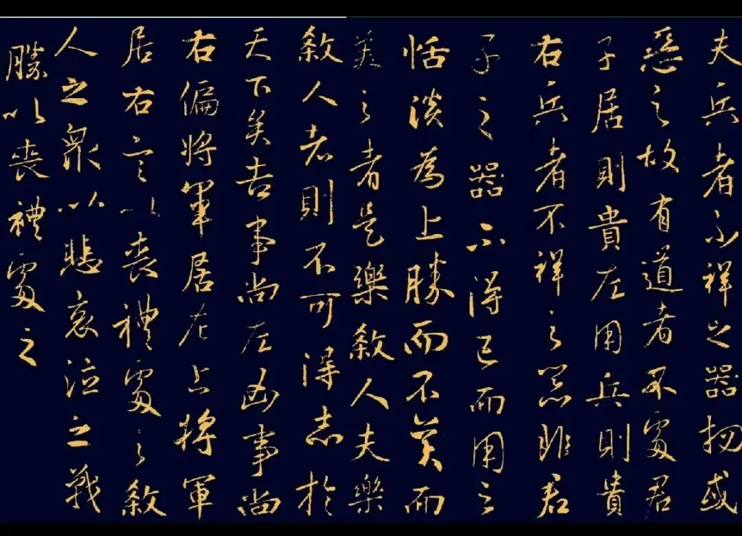 翻译:军队是不吉祥的工具,不是君子所用的工具,只有在不得已的时候才使用它,以恬淡无为为上策,胜利了也不以为美。