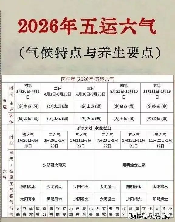 我们以2026年丙午为例,丙辛合化水,丙为阳干,岁水太过。寒气流行为胜,心火受邪。雨湿土气来复,土克水。百姓易患身热烦躁、心悸心痛等症,严重时腹部肿胀、气喘盗汗,还会出现寒气早至、雨雪异常等气候。故该年气候变化影响之脏腑主要有肾、心、脾。